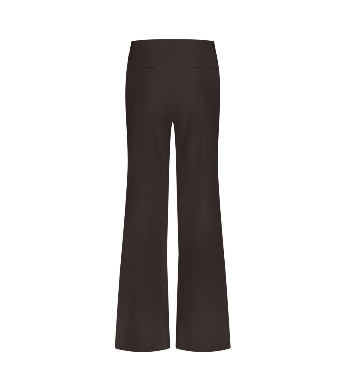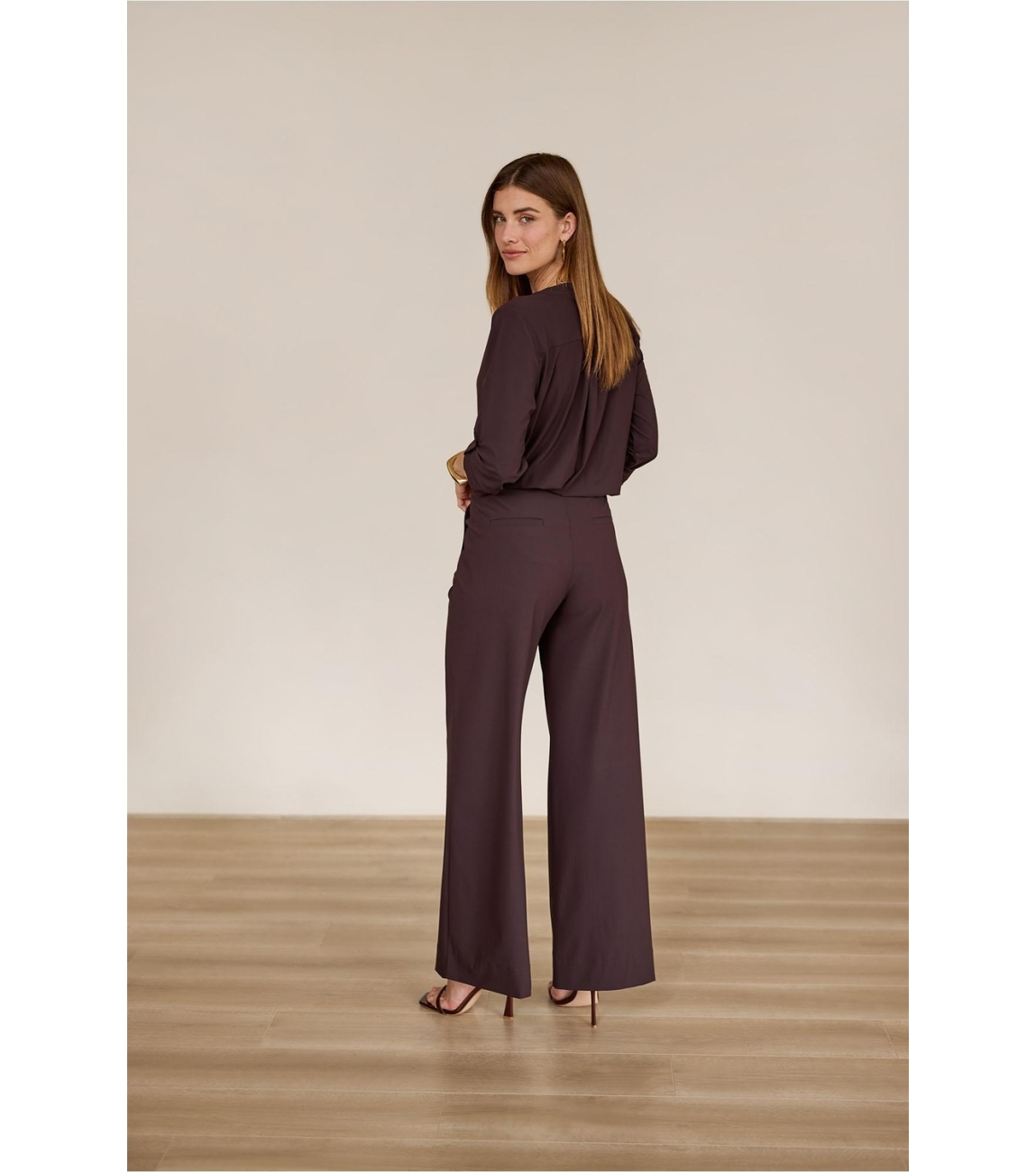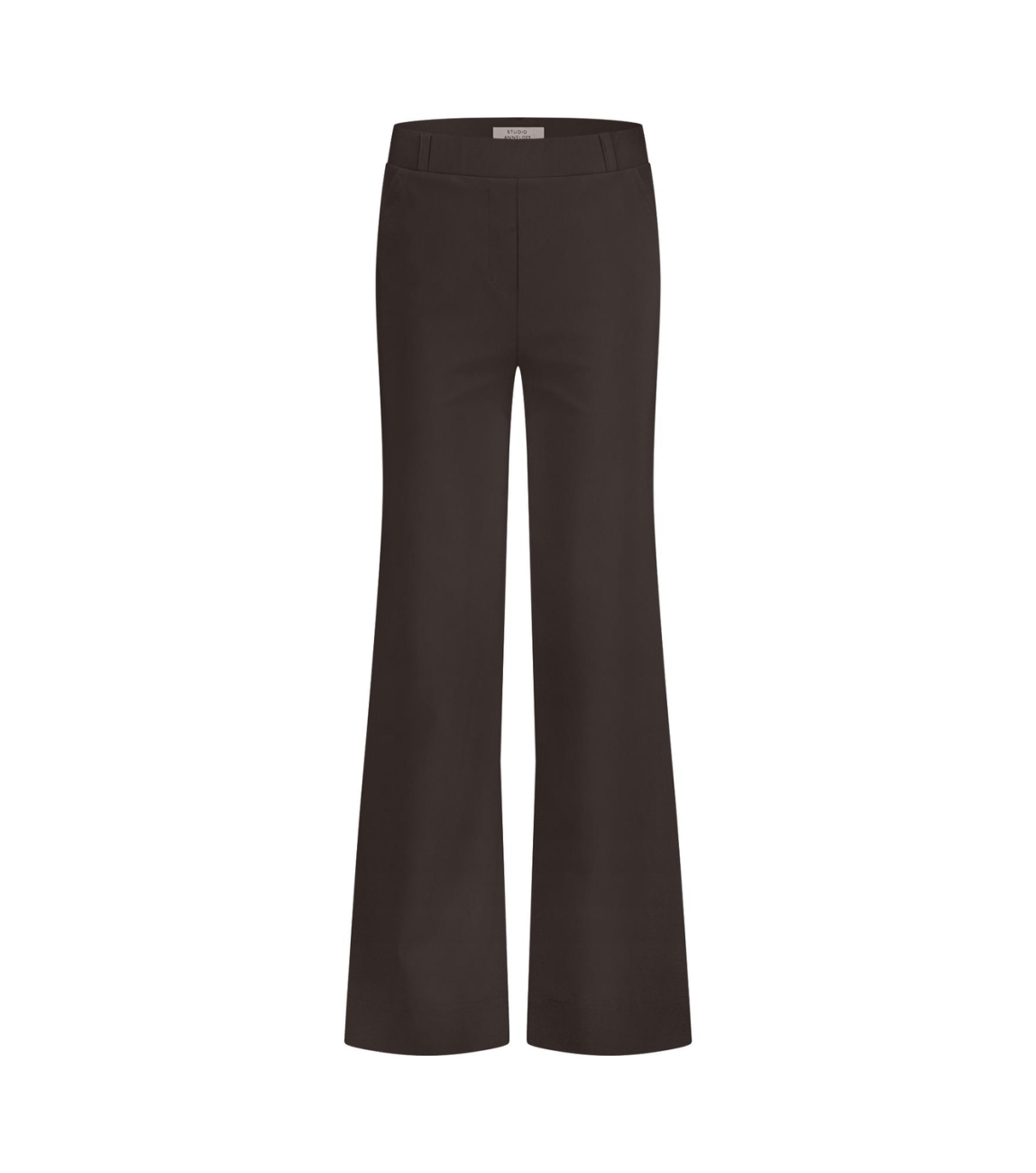 Studio Anneloes Lexie bonded trousers 94810.. Dit wide fit model sluit aan de bovenzijde door middel van een elastische tailleband met riemlusjes. Deze bruine broek van Studio Anneloes is voorzien van steekzakken, fake paspelzakken achter en heeft een brede zoom. Dit model is voor lange vrouwen.