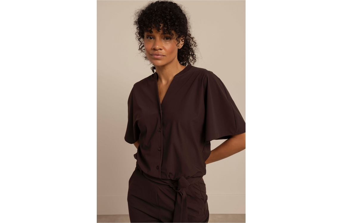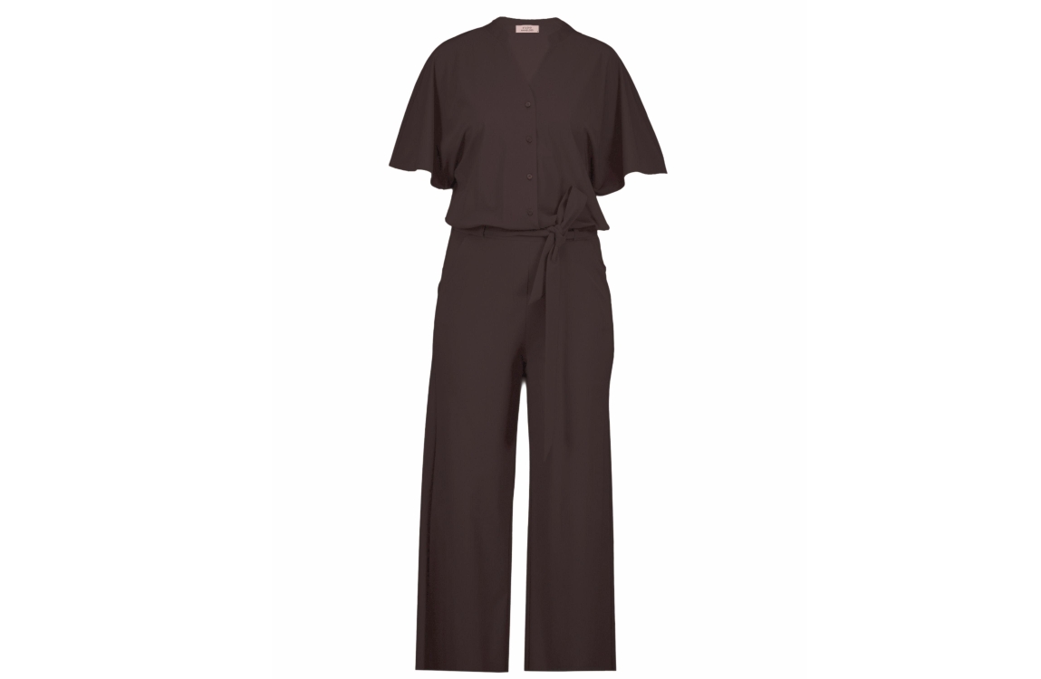 Studio Anneloes Maggie jumpsuit 8700 espresso. Dit rechtvallende model heeft een v-hals en korte mouwen. Deze bruine jumpsuit van Studio Anneloes sluit door middel van knopen aan de voorzijde en heeft rechtvallende pijpen, ceintuurlusjes en een ceintuur in de taille. Deze jumpsuit is gemaakt van travel materiaal.