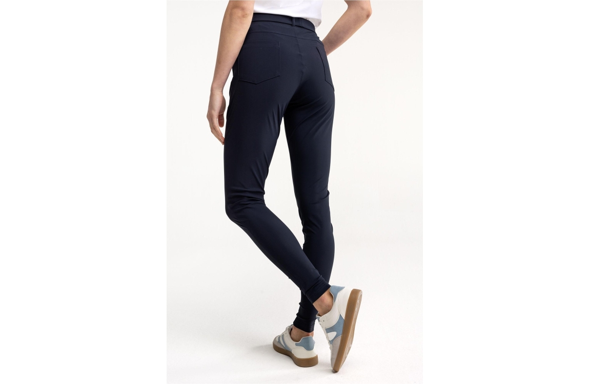 Studio Anneloes Margot trousers 94804. Dit slim fit model is voorzien van een tailleband met elastiek en riemlusjes. Deze donkerblauwe broek van Studio Anneloes heeft twee steekzakken en decoratieve paspelzakken aan de achterzijde. Dit model is uitgevoerd in een zwaardere travel stof.