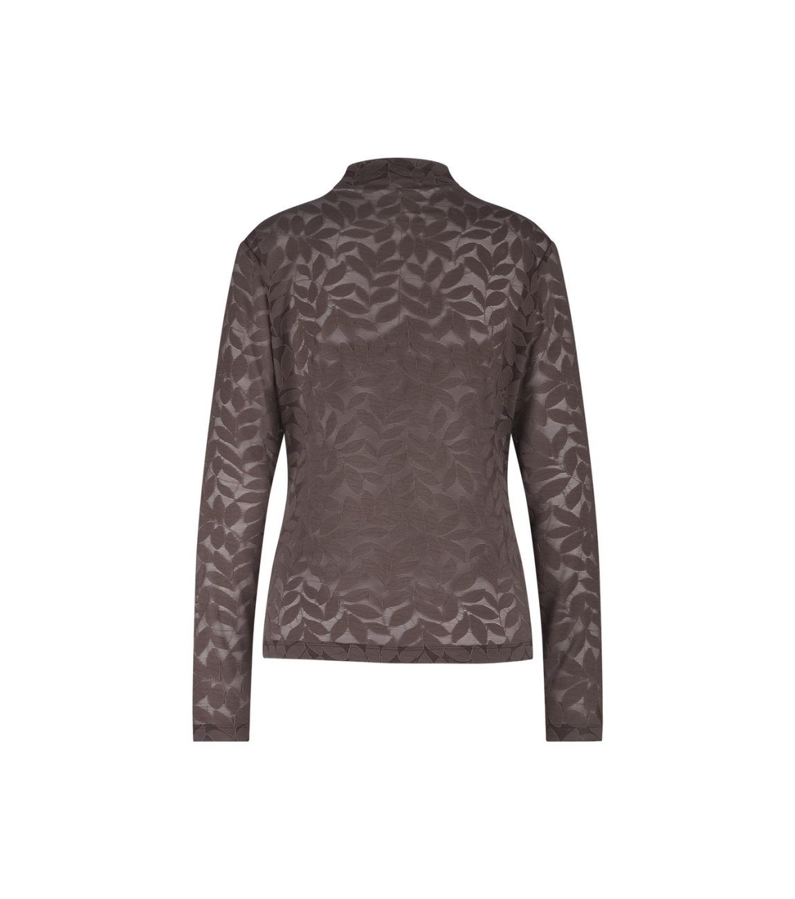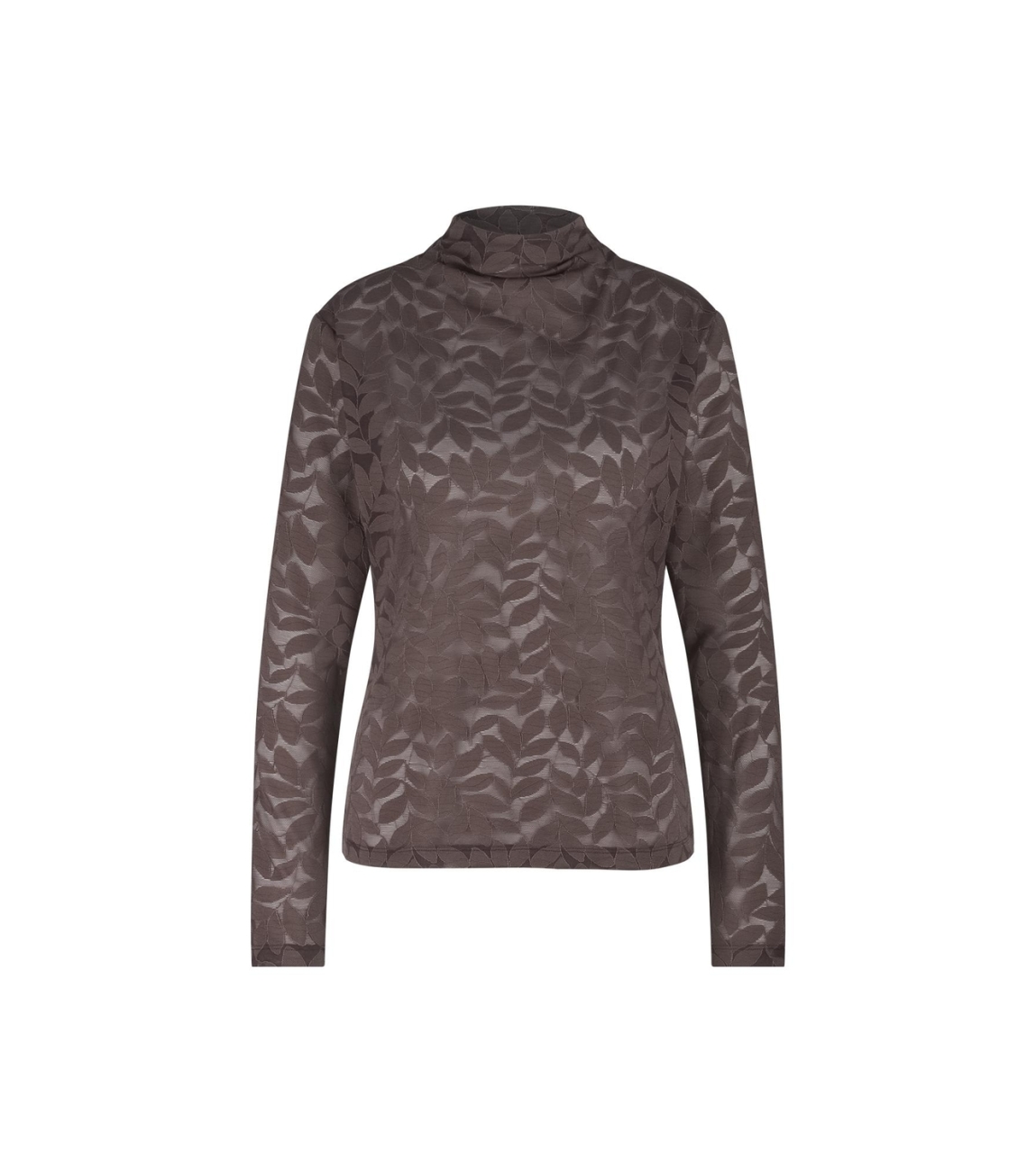 Studio Anneloes top Reagan lace 13258. Dit aangesloten model is voorzien van een turtle neck en heeft lange mouwen. Deze bruine top is bewerkt met kant.