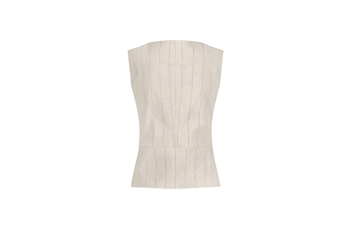 Studio Anneloes rebekka pinstripe gilet 126841490030. Dit rechtvallend model heeft een ronde hals en is mouwloos. Deze beige top van Studio Anneloes heefy zwarte strepen met klepzakken aan de voorzijde. Dit model sluit door knopen.