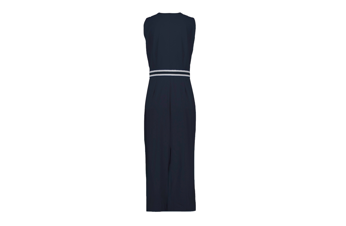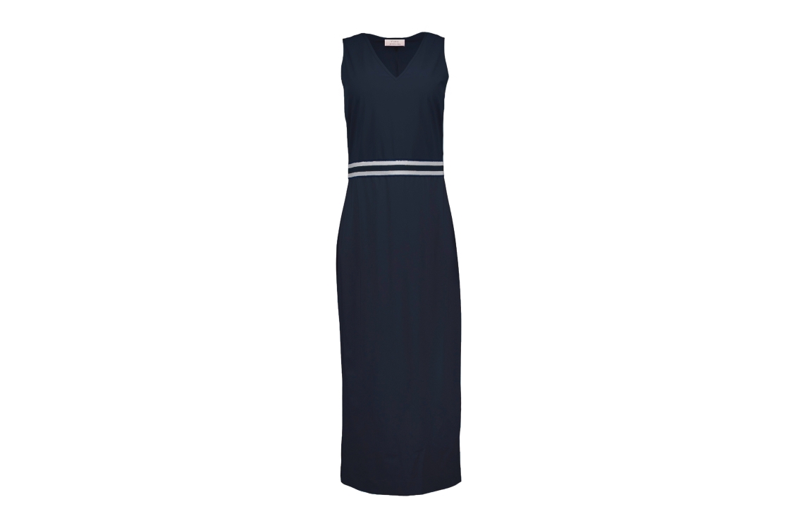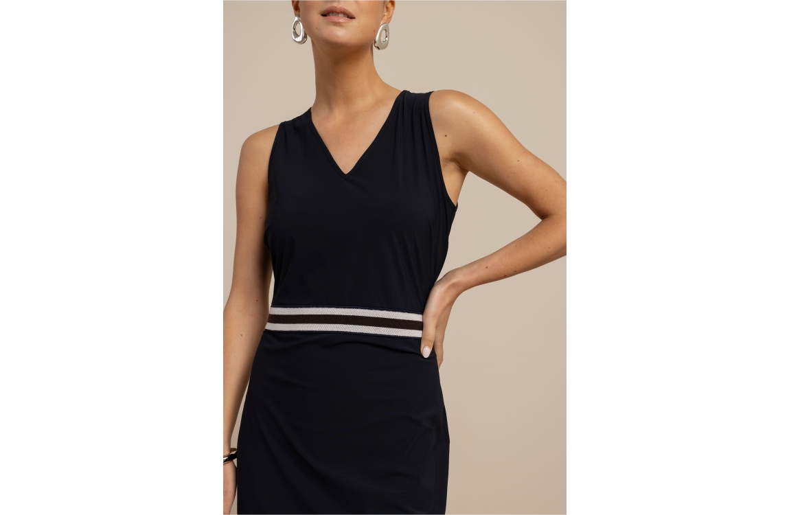 Studio Anneloes Tirza tape dress 13804. Dit rechtvallend model is voorzien van een v-hals en is mouwloos. Deze donkerblauwe jurk van Studio Anneloes beschikt over een split aan de achterzijde en is bewerkt met gestreepte elastische bies in de taille.