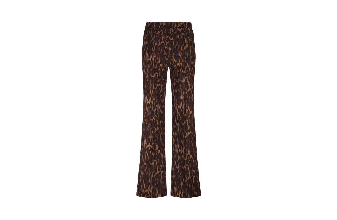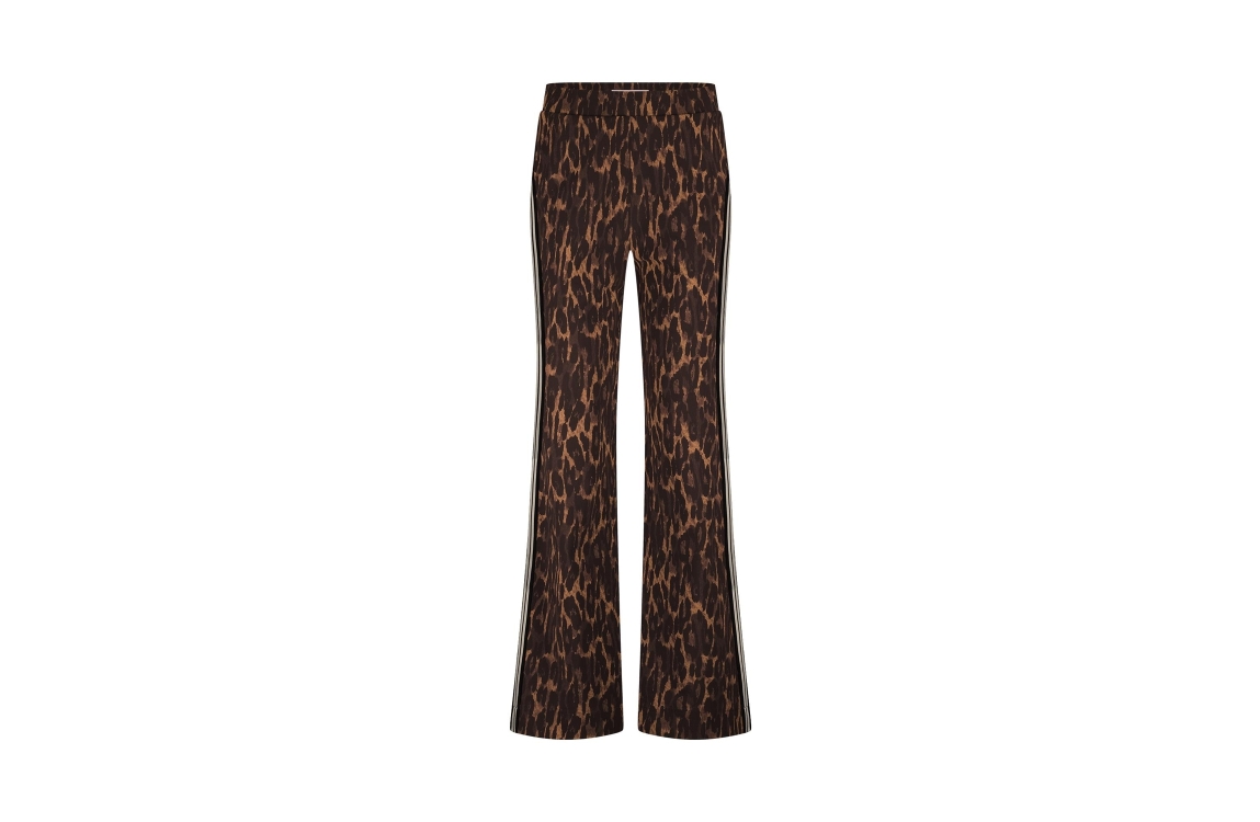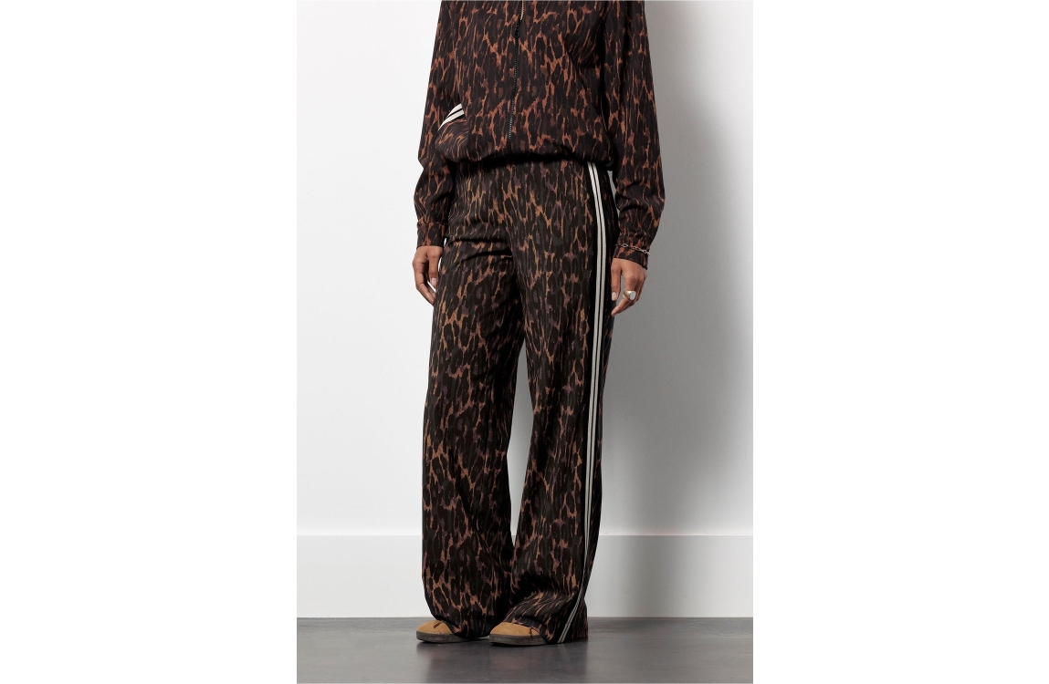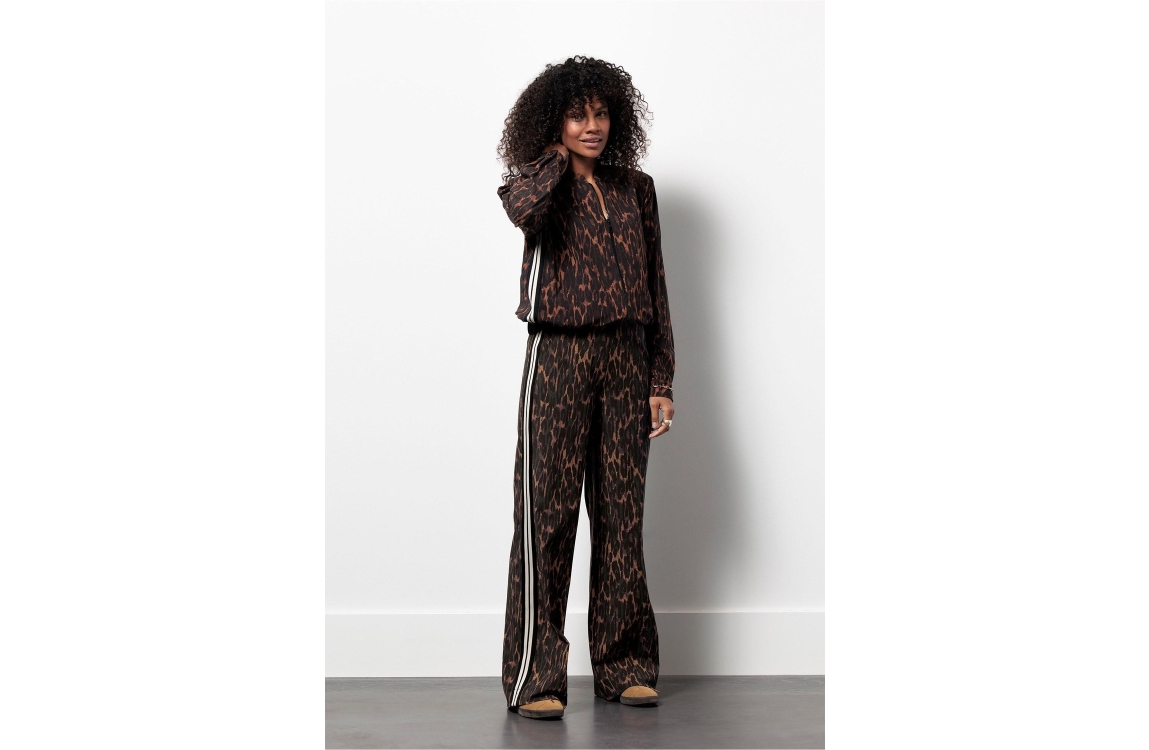 Studio Anneloes breok Trainer 13252. Dit wide leg model sluit door middel van een elastische boord en beschikt over twee steek- en paspelzakken. Deze bruine broek van Studio Anneloes is all-over bewerkt met een panterprint en is afgewerkt met zwart/witte biezen aan de zijkanten.