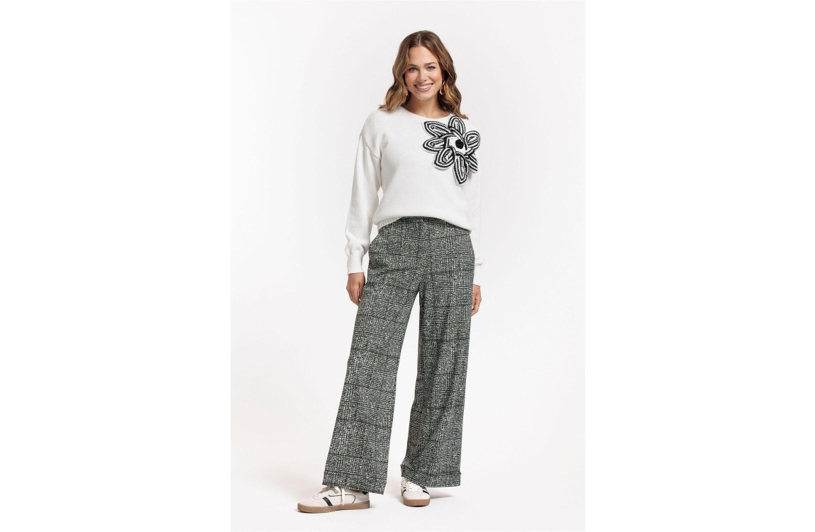 Studie Anneloes valeria chunky flower pullover. Dit rechtvallend model heeft een ronde hals met lange mouwen.Deze witte pullover van Studio Anneloes is bewerkt met een zwart/witte bloem op het voorpand.