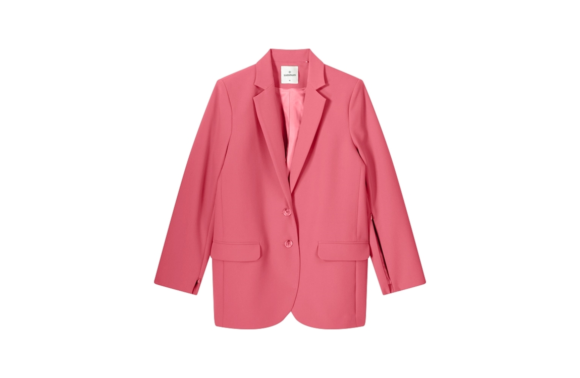 Summum blazer 1s1145. Dit oversized model is voorzien van een reverskraag, lange mouwen en schoudervullingen. Deze rouge blazer van Summum sluit door middel van twee knopen en beschikt over klepzakken.