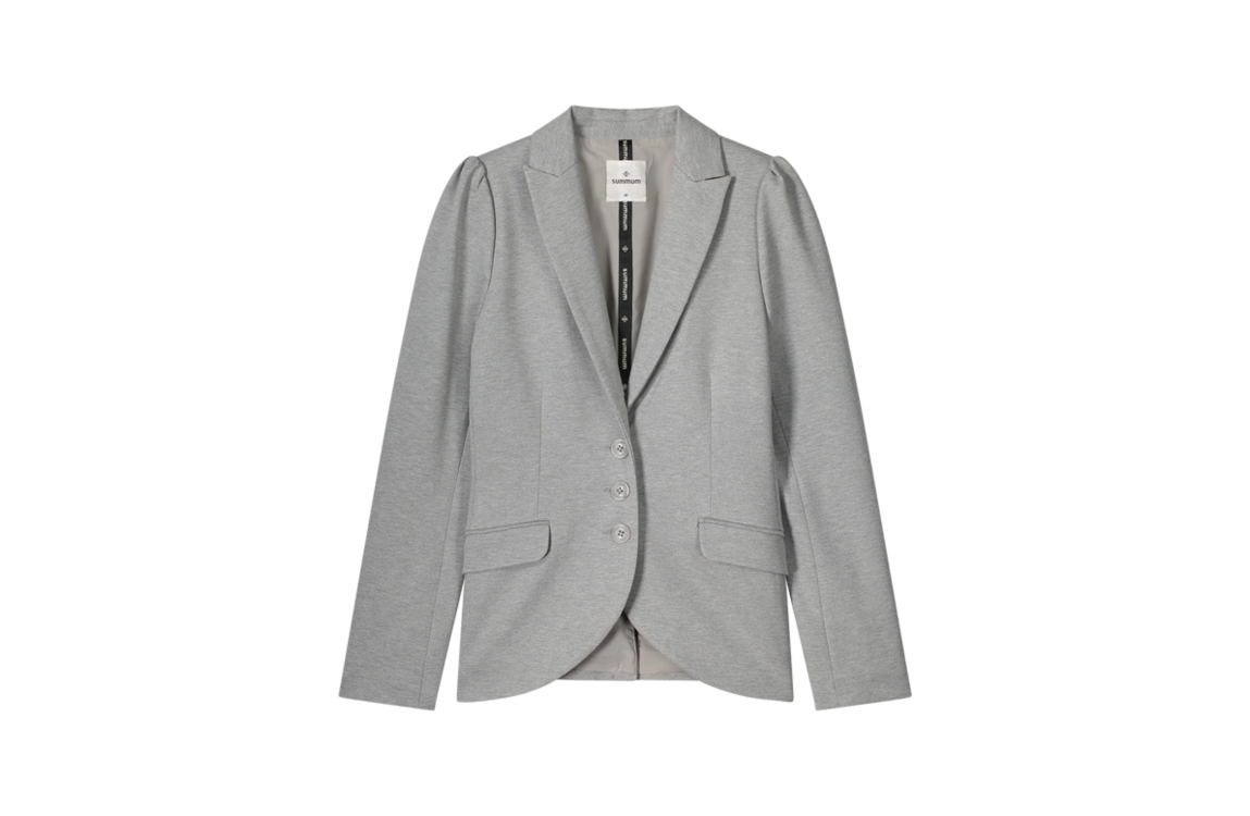 Summum blazer 1s1200-11580. Dit aangesloten model is voorzien van een v-halslijn en heeft lange mouwen. Deze grijs gemeleerde blazer van Summum sluit door middel van knopen en is afgewerkt met twee klepzakken aan de voorzijde. Dit model is afgewerkt met een kleine pofmouw en bevat stretch.