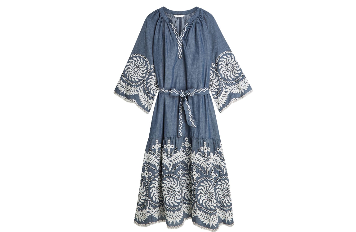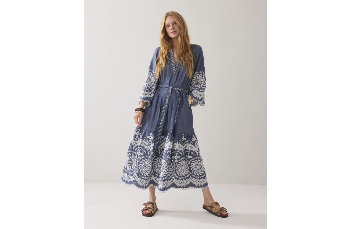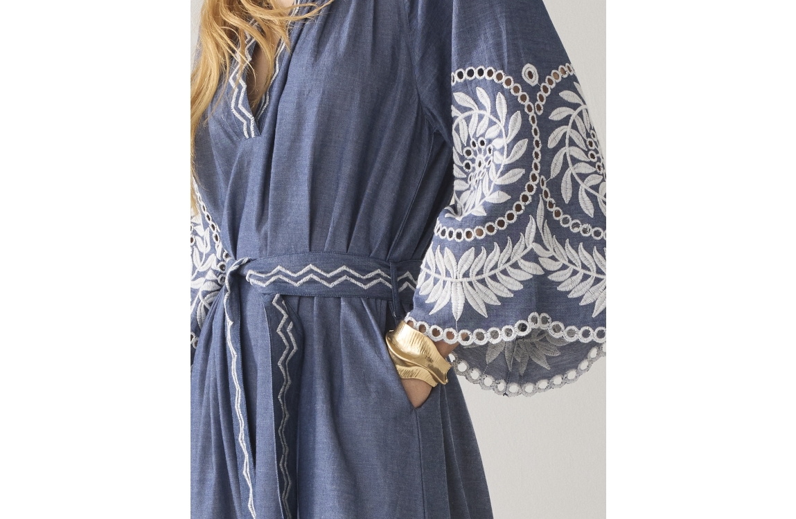 Summum Woman Dress Chambray embroidered 490 Indigo. Dit soepelvallende model is voorzien van een v-hals en wijde mouwen. Deze blauwe jurk van Summum is afgewerkt met borduurdetails en ruches aan de onderkant. Dit model wordt geleverd met een bijpassende geborduurde riem.