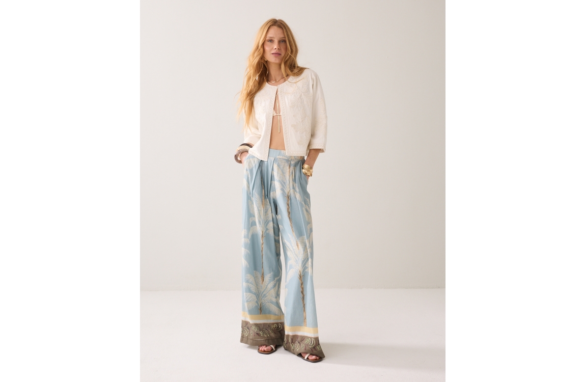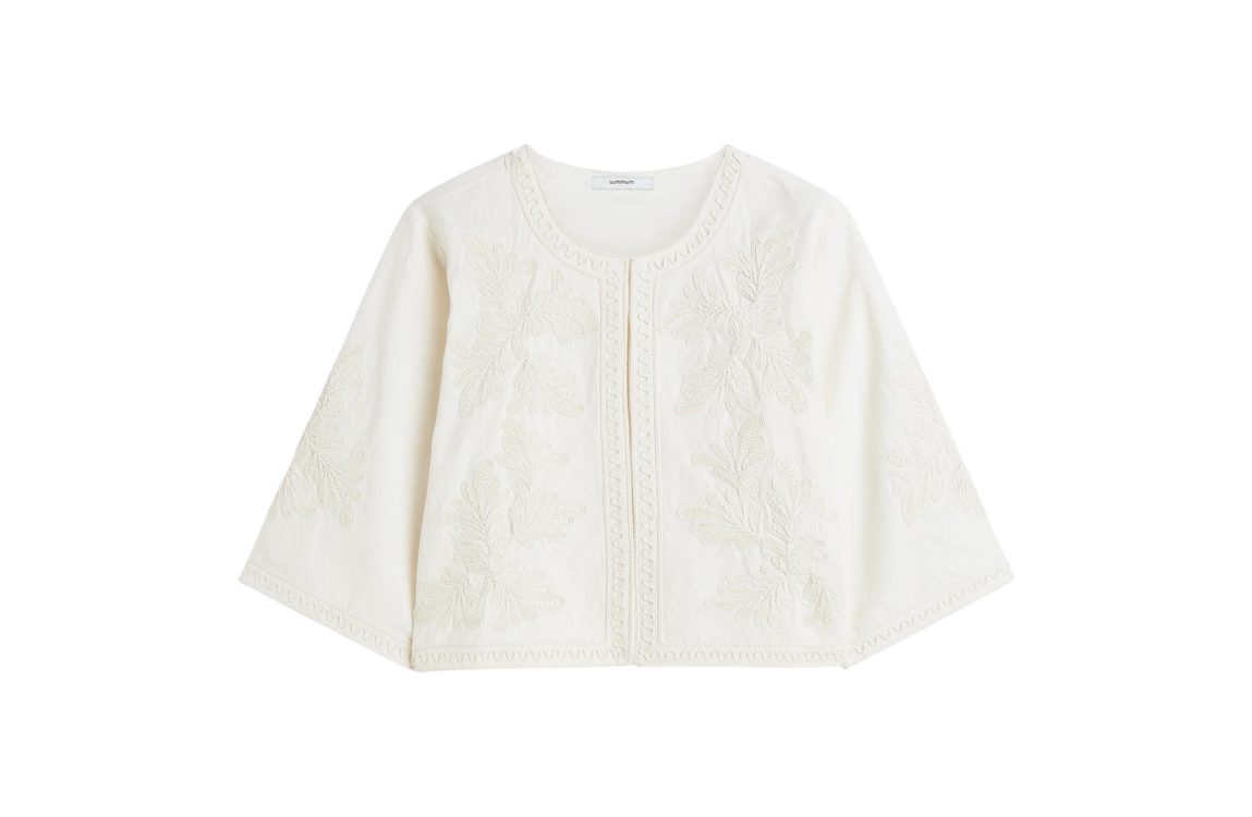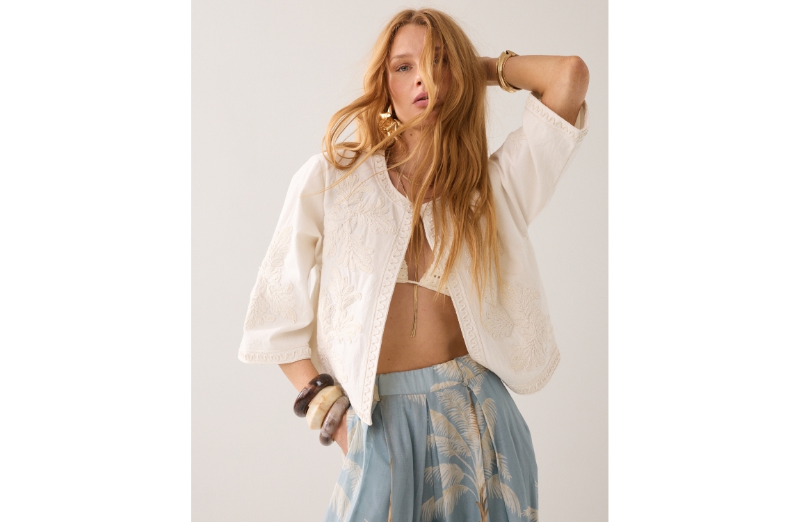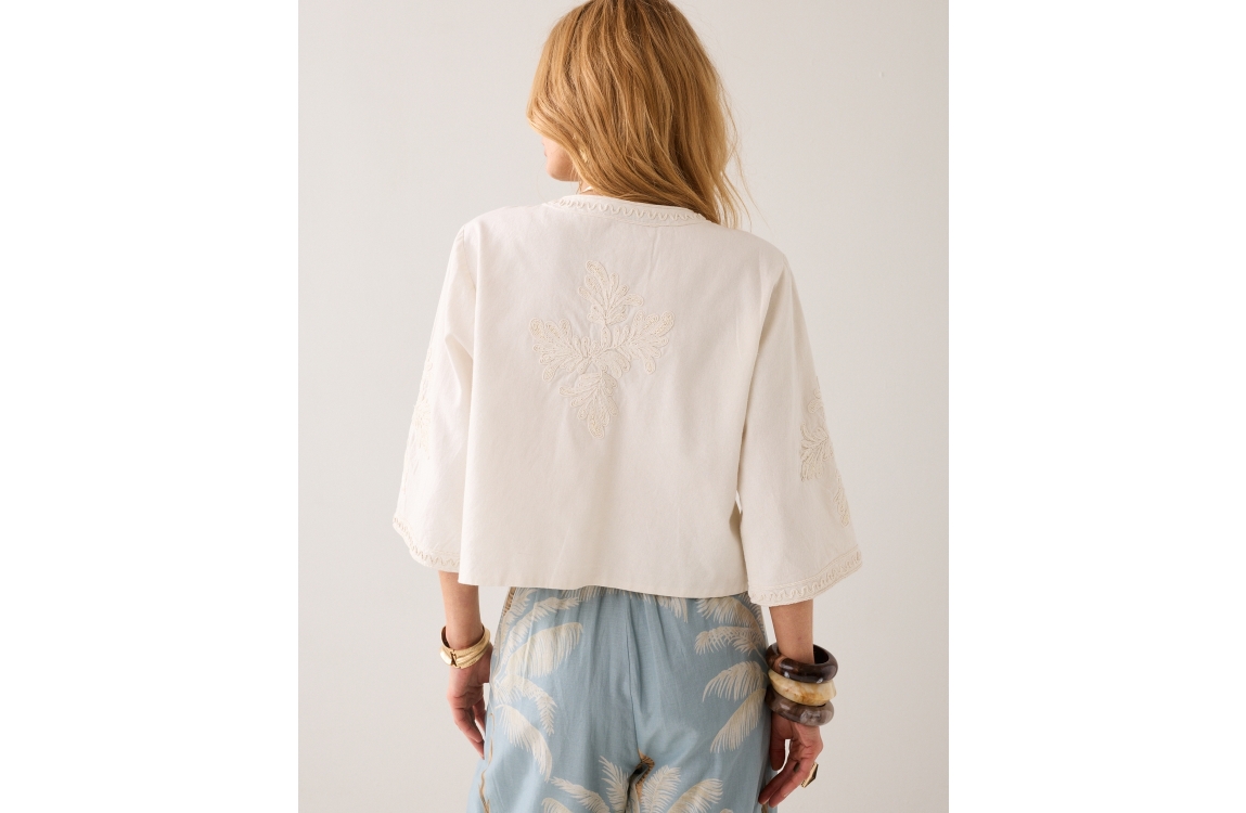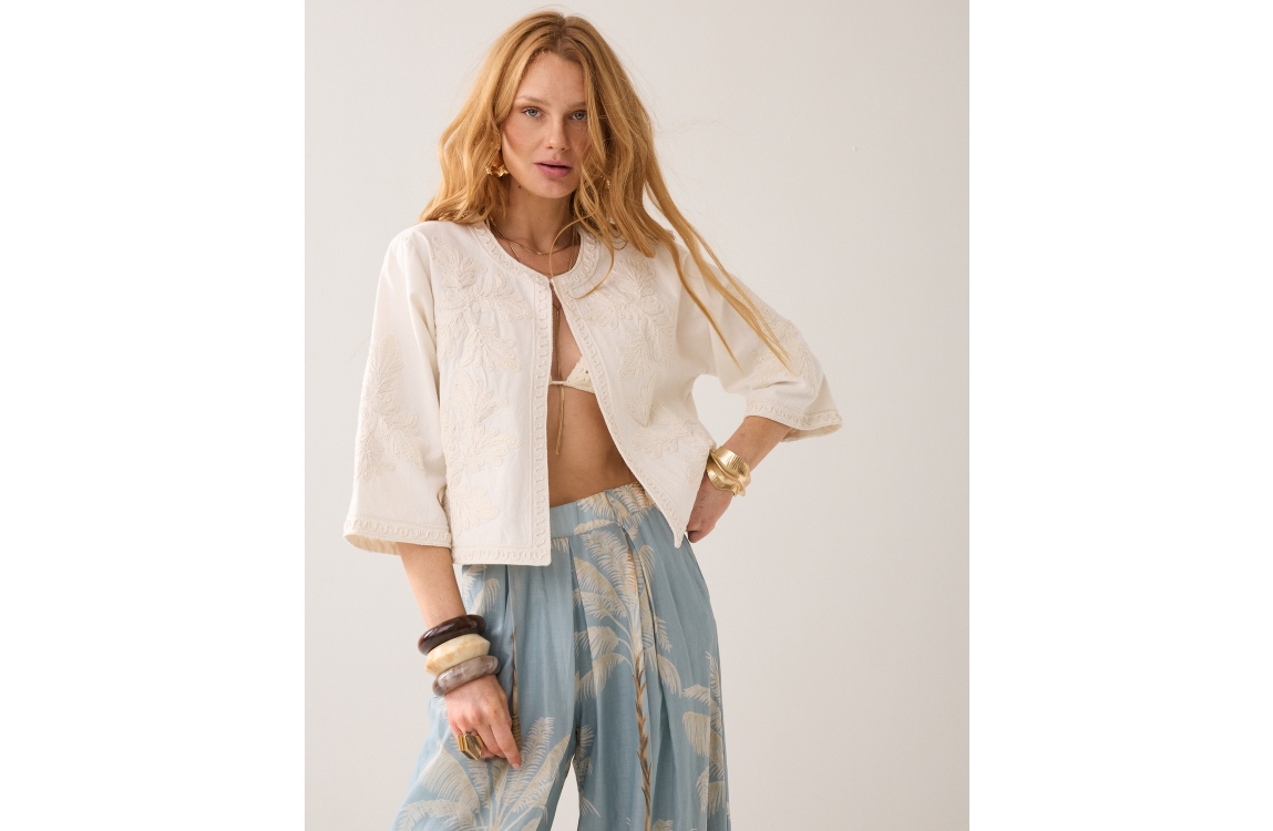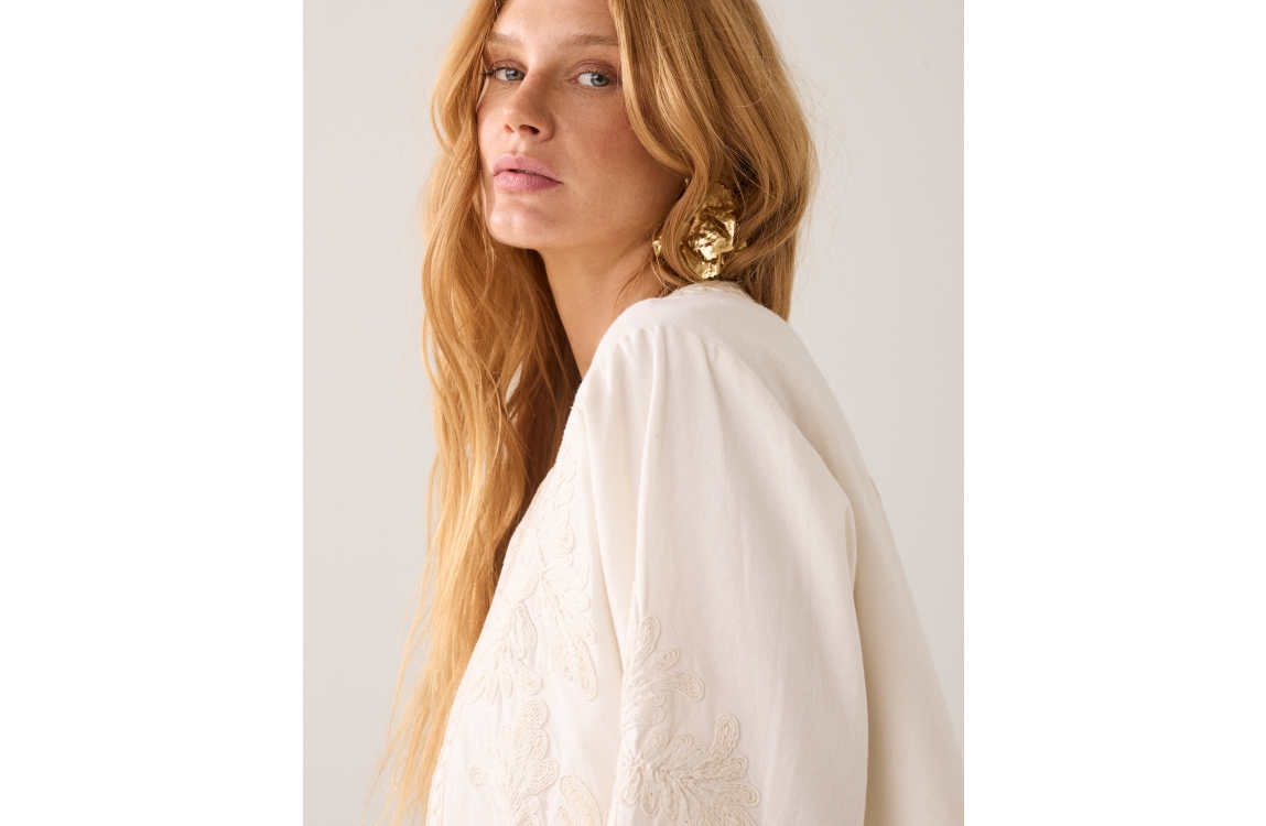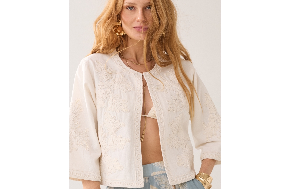Summum Woman Jack Embroidery 1s1304-12470. Dit rechtvallend model heeft een ronde hals en driekwart mouwen. Dit beige/creme kleurige jack van Summum is bewerkt met een embroidery patroon met kraaltjes en sluit middels een knoopje aan de bovenzijde.