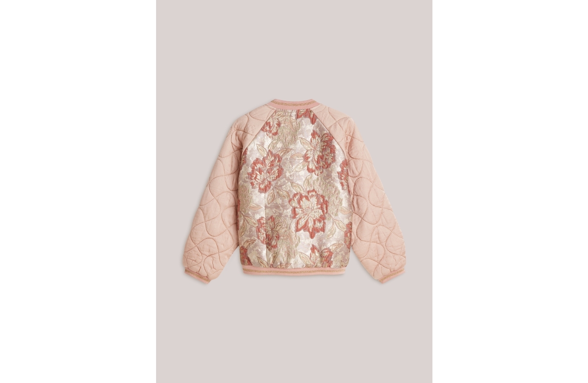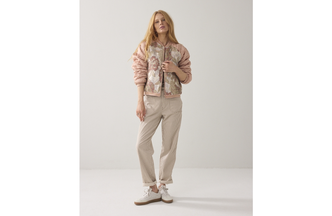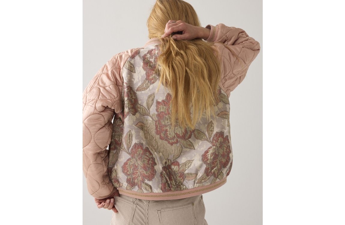 Summum Woman Jacket Rose jacquard mix 570 Faded rose. Dit bomber model heeft een lage opstaande kraag en lange mouwen. Het roze jasje sluit aan de voorzijde door middel van een rits en is voorzien van twee steekzakken. Het model heeft matte satijnen mouwen, ribboorden met een fijne lurexstreep en is op de body bewerkt met jacquard materiaal.