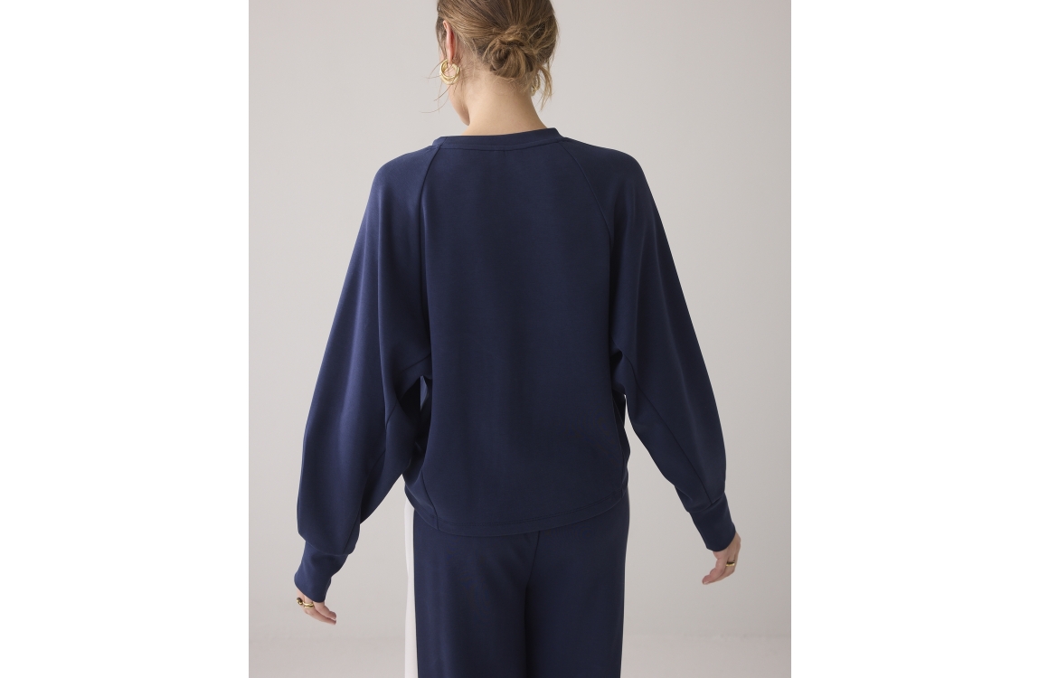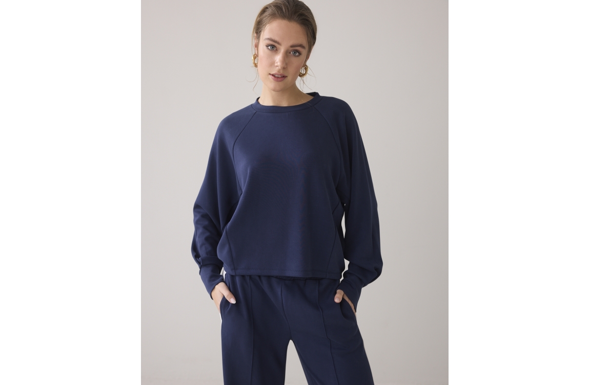 Summum Woman sweater 3s5084-30606. Dit rechtvallend model is voorzien van een ronde hals en raglan mouwen. Deze donkerblauwe sweater van Summum is bewerkt met siernaden en heeft een leuk plooidetail bij de manchet.