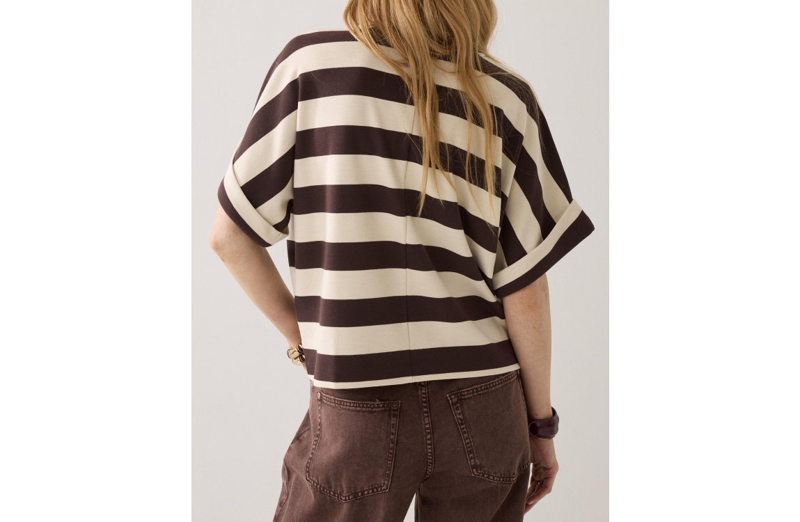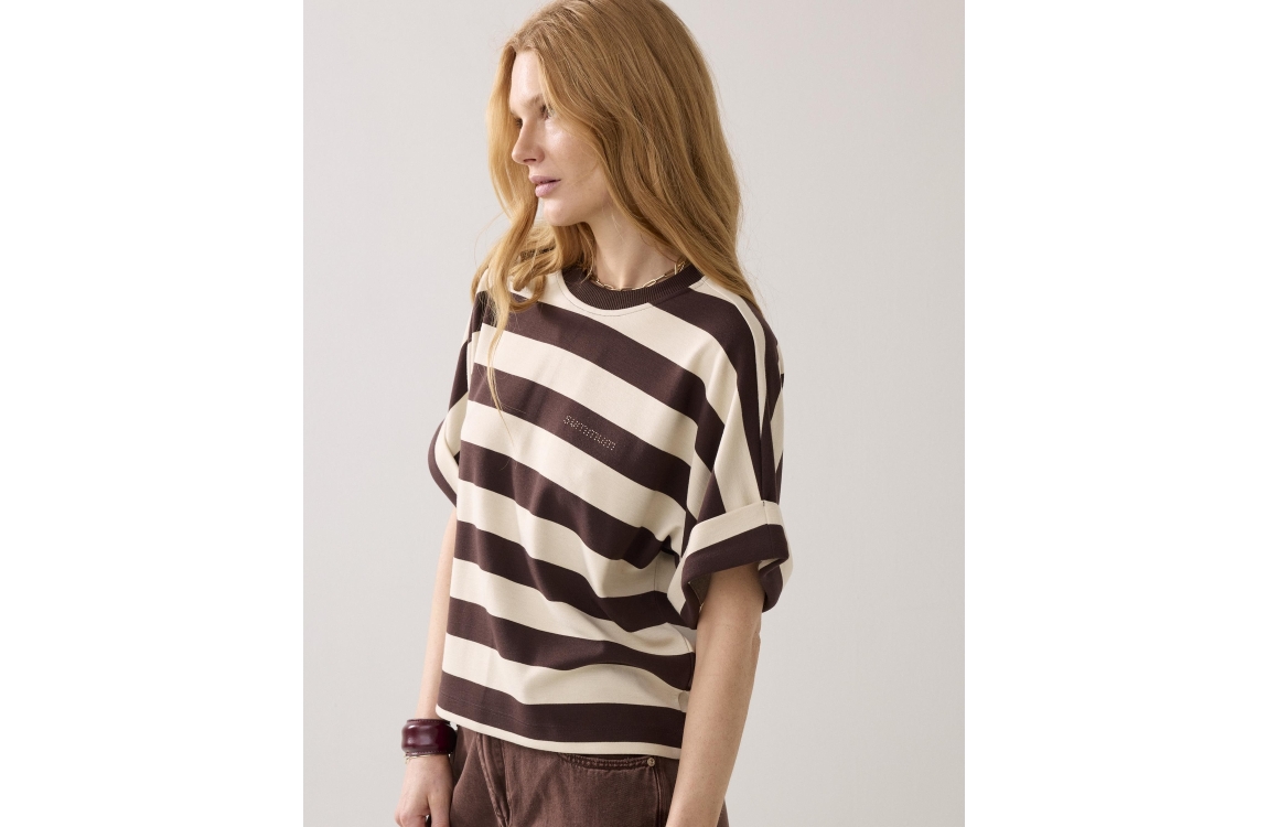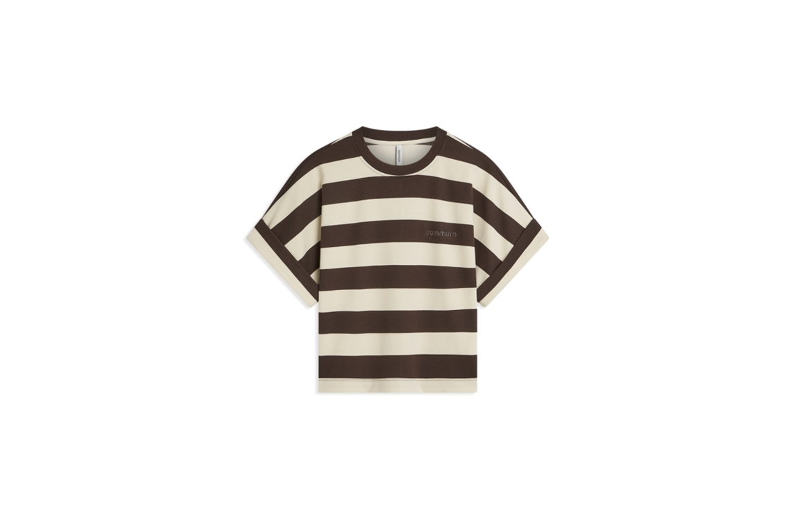 Summum Woman shirt big stripe heavy jersey 3s5112-30681. Dit rechtvallend model is voorzien van een ronde hals en heeft korte mouwen bewerkt met een overslag. Deze bruine shirt van Summum is bewerkt met strepen en afgewerkt met het logo op de borst.