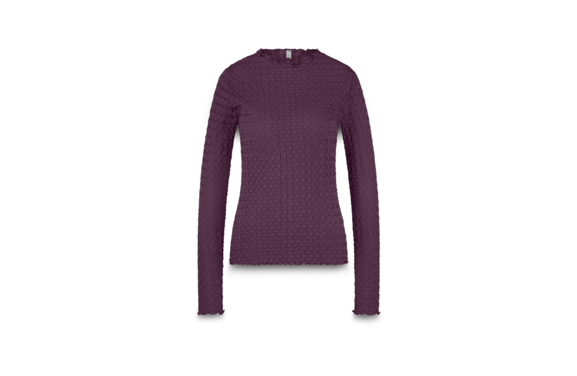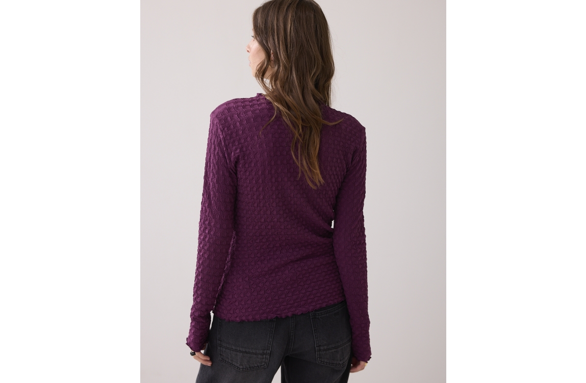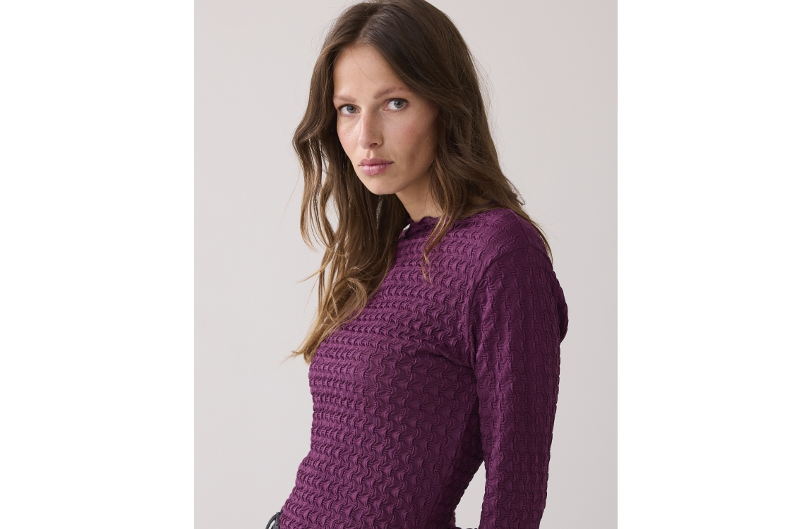Summum Woman top 3s5166-30721. Dit rechtvallend model is voorzien van een hoge ronde hals en heeft lange mouwen. Deze aubergine kleurige top van Summum Woman is uitgevoerd in een structuur.