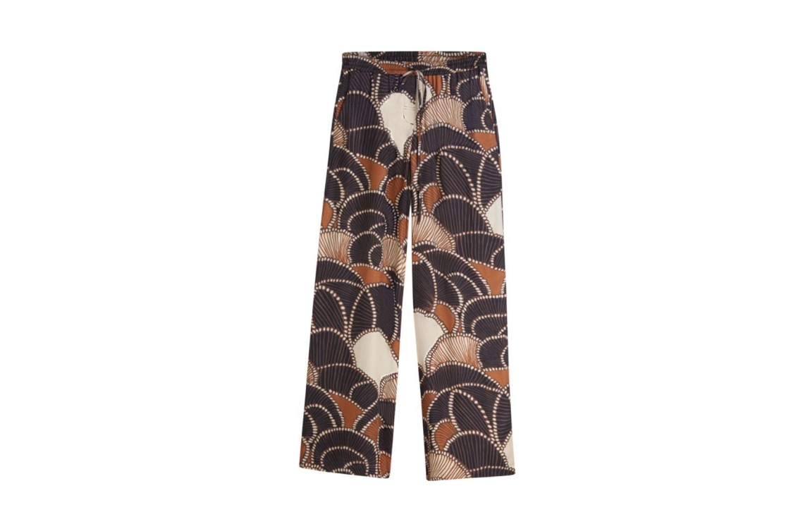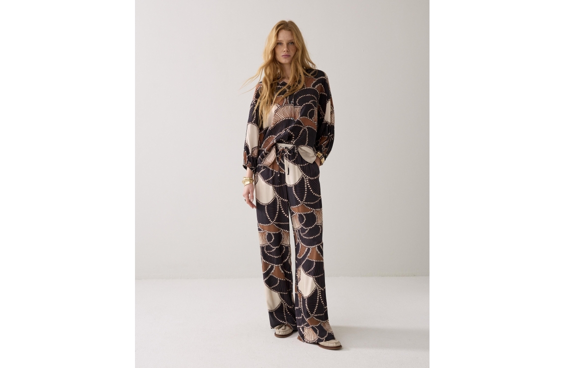 Summum Woman trousers all over twill satin 4s2964-12387. Dit wijde model is voorzien van wijde pijpen, sluit door middel van een elastische tailleband met koordsluiting en heeft twee steekzakken. Deze bruine/zwarte broek van Summum is uitgevoerd in een soepele satijntwill met een lichte glans.