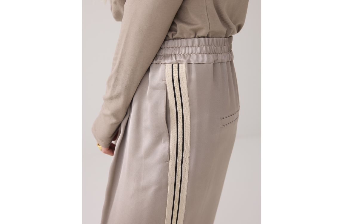 Summum Woman broek 4s2866-12084. Dit wide leg model sluit door middel van een elastische boord en is voorzien van twee steekzakken aan de voorzijde en twee paspelzakken aan de achterzijde. Deze champagne kleurige broek van Summum Woman is glanzend uitgevoerd en afgewerkt met een gestreepte bies aan de zijkanten.