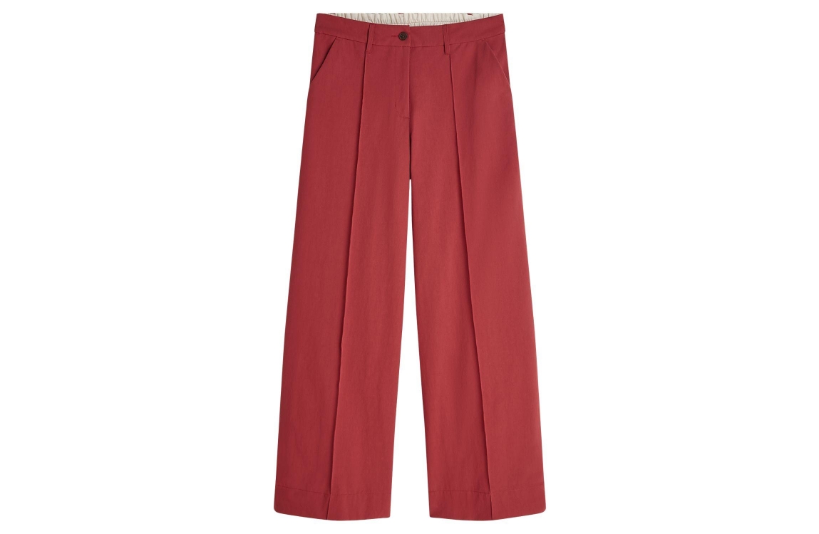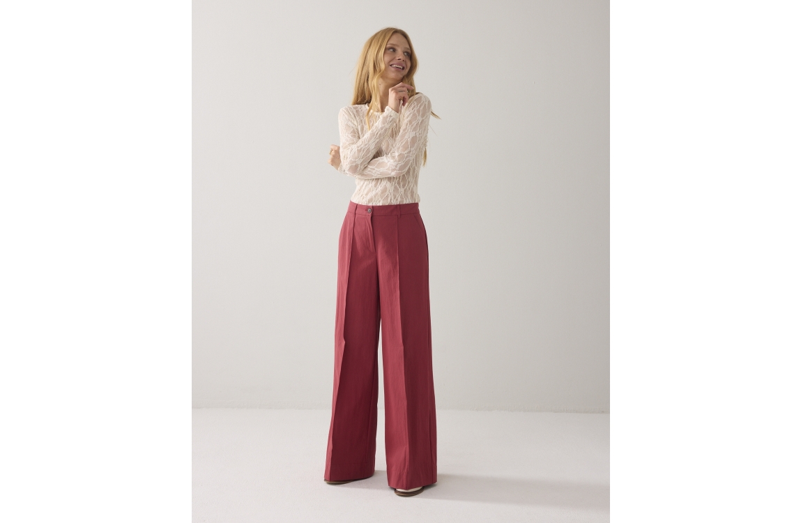 Summum Woman Trousers wide leg Cotton blend 559 Brick red. Dit wide leg model sluit door middel van een knoop en een rits. Deze rode broek van Summum is voorzien van twee steekzakken aan de voorzijde en twee decoratieve klepzakken aan de achterzijde. Dit model is bewerkt met een lichte glans en heeft een elastiche tailleband achter.