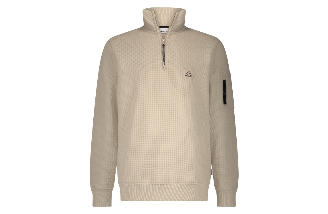Supply en Co Halvar Halfzip Sweat 00075190 Pebble. Dit rechtvallende model heeft een opstaande kraag die sluit door een rits en heeft lange mouwen. Deze beige sweater van Supply en Co is afgewerkt met boorden.