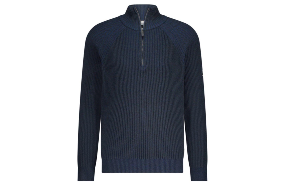 Supply en Co Zev Halfzip 3290 Navy. Dit rechtvallende model heeft een opstaande kraag die sluit door een rits en heeft lange mouwen. Deze navy trui van Supply en Co is uitgevoerd in een rib structuur en afgewerkt met boorden.
