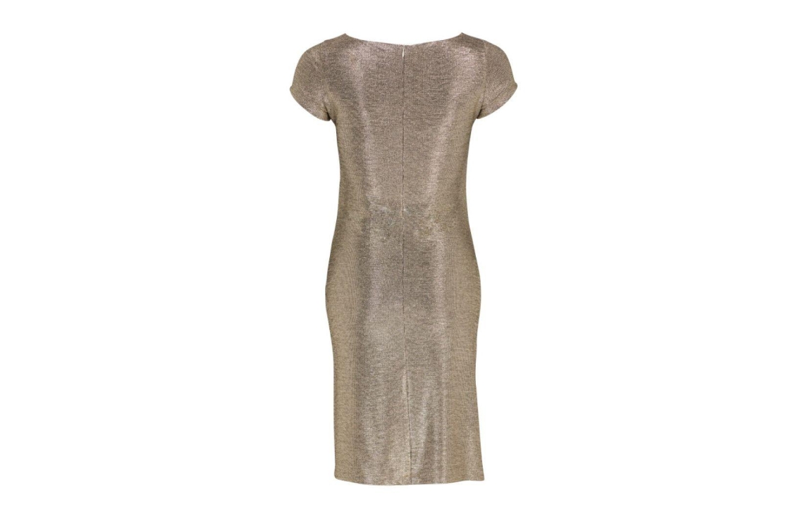 Swing jurk 777614. Dit aangesloten model is voorzien van een ronde hals en heeft korte mouwen. Deze goudkleurige jurk van Swing sluit aan de achterzijde door middel van een blinde rits en is aan de voorzijde bewerkt met gedrapeerde details.