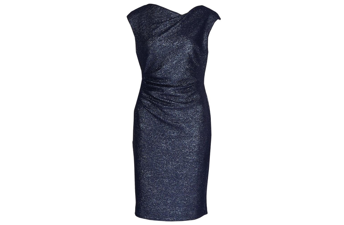 Swing jurk 5AH23500. Dit aangesloten model heeft een Asymmetrische halslijn en is mouwloos. Deze donkerblauwe jurk van Swing sluit aan de achterzijde door middel van een rits en is all-over bewerkt met glitterdetails. Dit model is afgewekt met gedrapeerde details op de taille en is voorzien van een onderjurk.