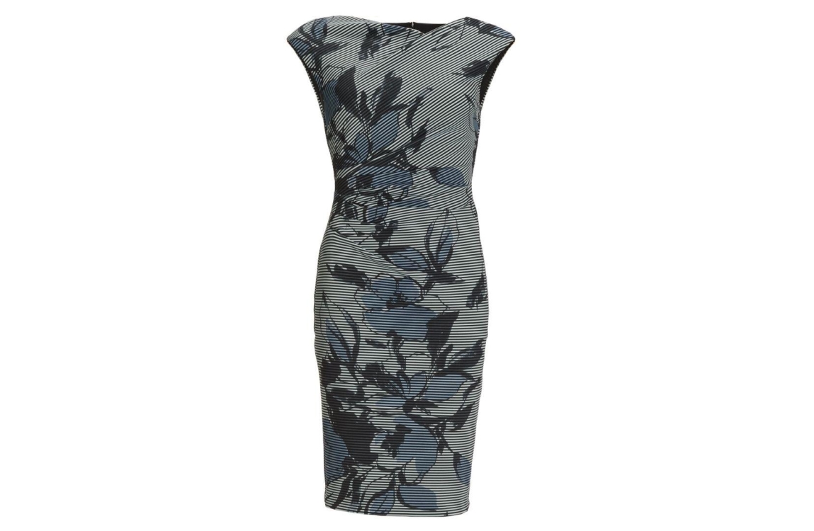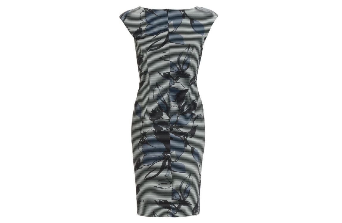 Swing jurk 5AJ09200. Dit aangesloten model is voorzien van een boot hals en heeft korte mouwen. Deze blauwe jurk van Swing sluit aan de achterzijde door middel van een blinde rits en is aan de voorzijde bewerkt met gedrapeerde details. Dit model is uitgevoerd in een streep- en bloemenpatroon.