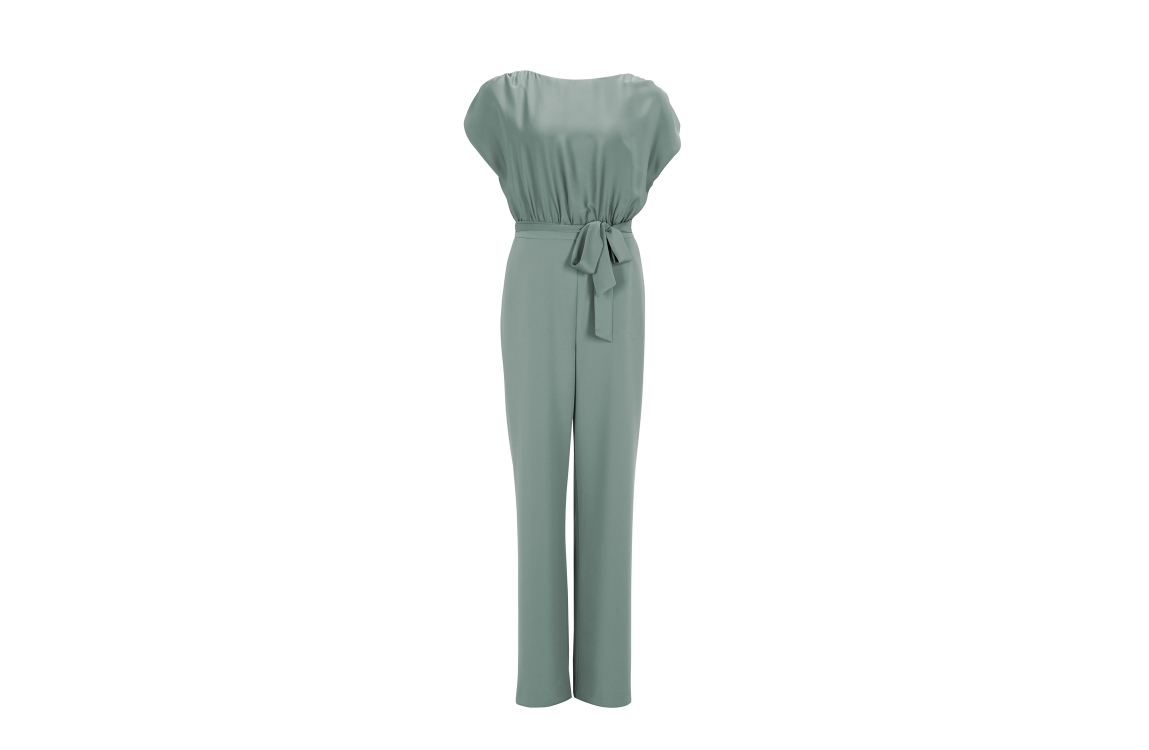 Swing Jumpsuit 3AD00400. Dit regular fit model heeft een ronde halslijn met plooidetails en korte mouwen. Deze groene jumpsuit van Swing sluit aan de achterzijde door middel van een knoop- en ritssluiting en is voorzien van een strikceintuur op de taille. Het model is uitgevoerd in een satijnen-look aan de bovenzijde en is afgewerkt met een open rug. Deze jumpsuit beschikt over twee schuine steekzakken.