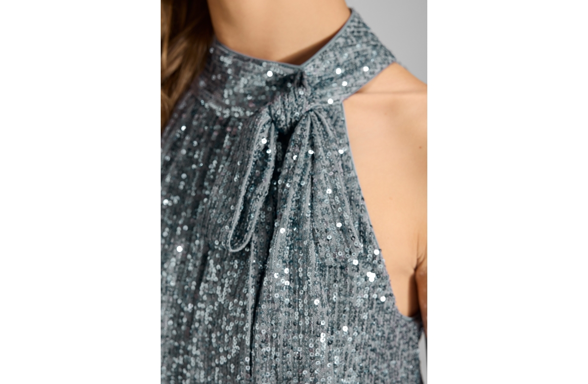 Swing jumpsuit 3AH03900. Dit rechtvallend model heeft een ronde hals met strik, is mouwloos en sluit door middel van een blinde rits. Deze blauwe jumpsuit van Swing is voorzien van een open rug, pailletten bovenzijde en stretchy onderkant.