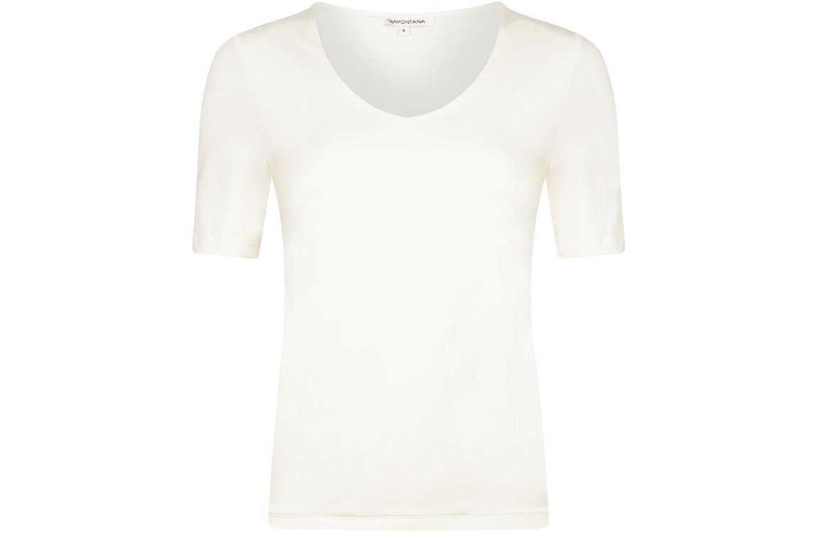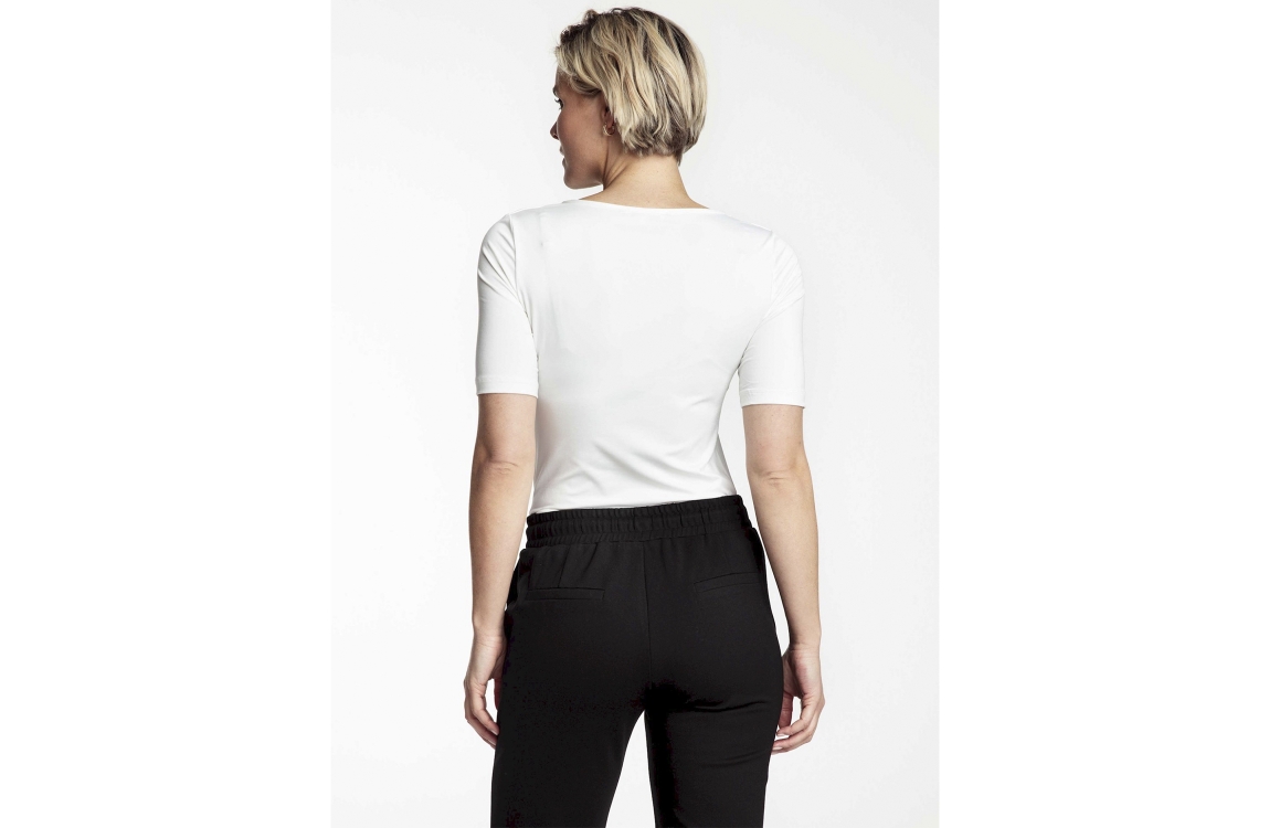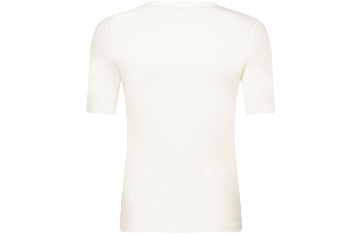 Tramontana top Paula. Dit aangesloten model is voorzien van een ronde hals en heeft korte mouwen. Dit off-white shirt van Tramontana is uitgevoerd in een zachte elastische kwaliteit en is een fijn basis item!