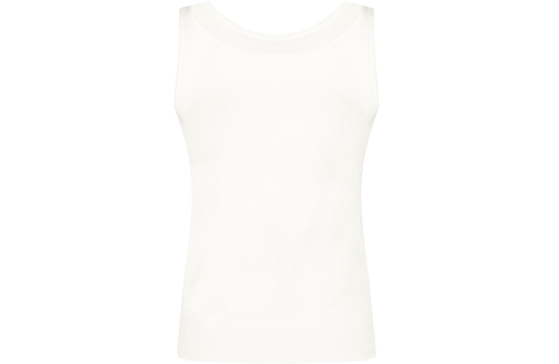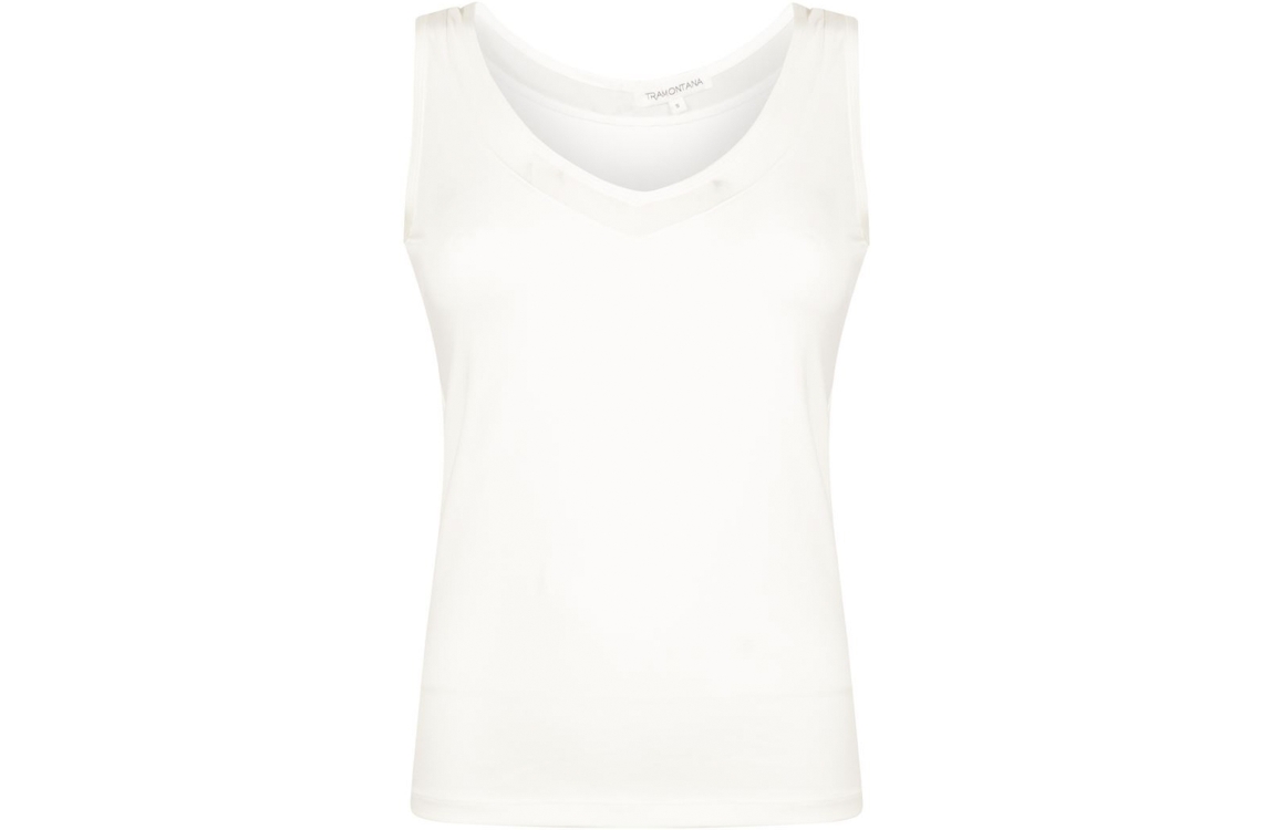 Tramontana hemd PAM. Dit aangesloten model is voorzien van een v-hals en is mouwloos. Dit ecru/witte basic hemd van Tramontana is bij de halslijn afgewerkt met mesh en is uitgevoerd in een elastische kladde kwaliteit.