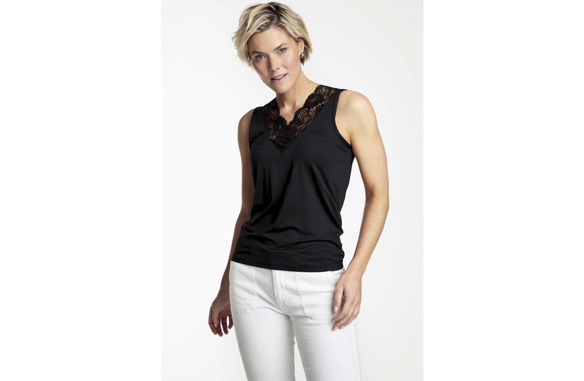 Tramontana hemd Pippa. Dit aangesloten model is voorzien van een v-hals en is mouwloos. Dit basic zwarte hemd van Tramontana is bij de hals afgewerkt met kant en is uitgevoerd in een gladde elastische kwaliteit.