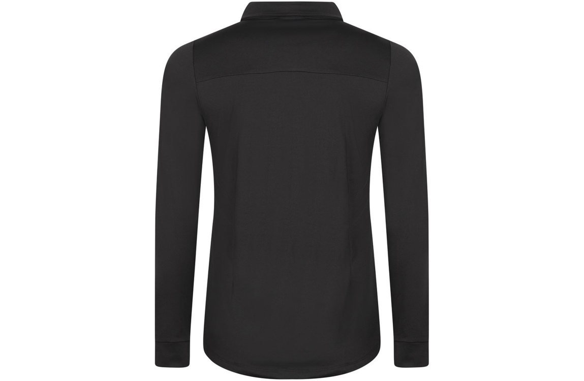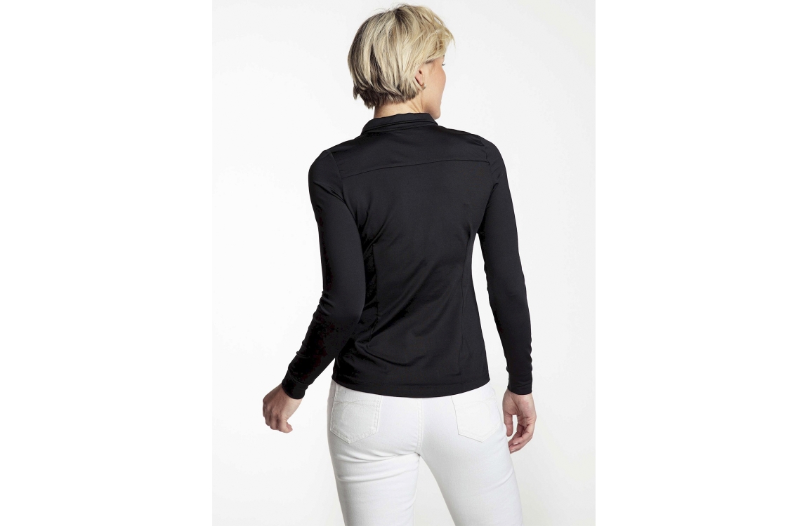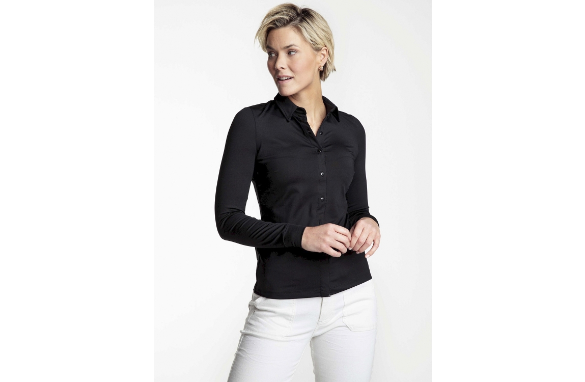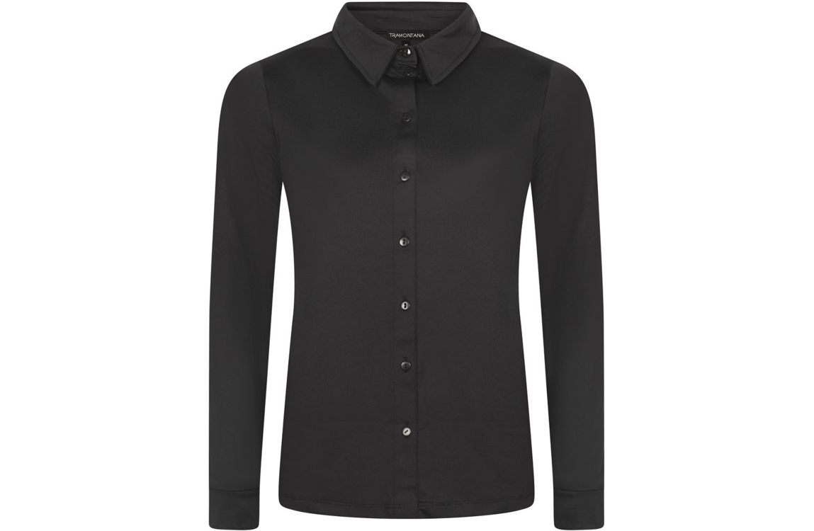 Tramontana blouse Polly. Dit aangesloten model is voorzien van een kraag en heeft lange mouwen. Deze zwarte blouse van Tramontana sluit door middel van knopen aan de bovenzijde, de onderzijde is dicht gestikt. Dit model is uitgevoerd in een zachte elastische kwaliteit. Een fijn basis item!