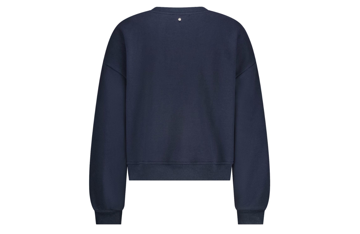 Tramontana sweater C19-18-602. Dit soepelvallende model heeft een ronde halslijn, gedetailleerd met kraaltjes en lange mouwen. Deze donkerblauwe sweater van Tramontana heeft afgewerkte boorden en is uitgevoerd in stretchkwaliteit.