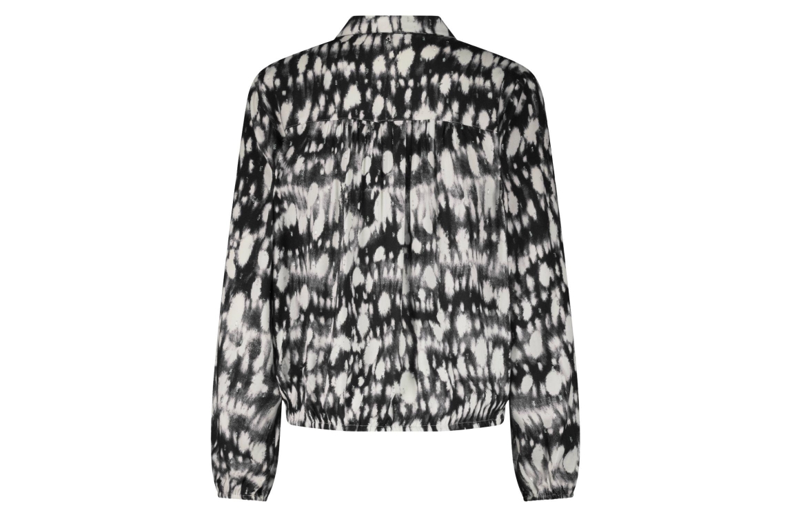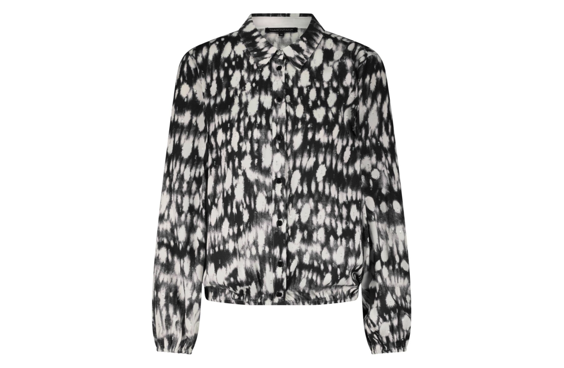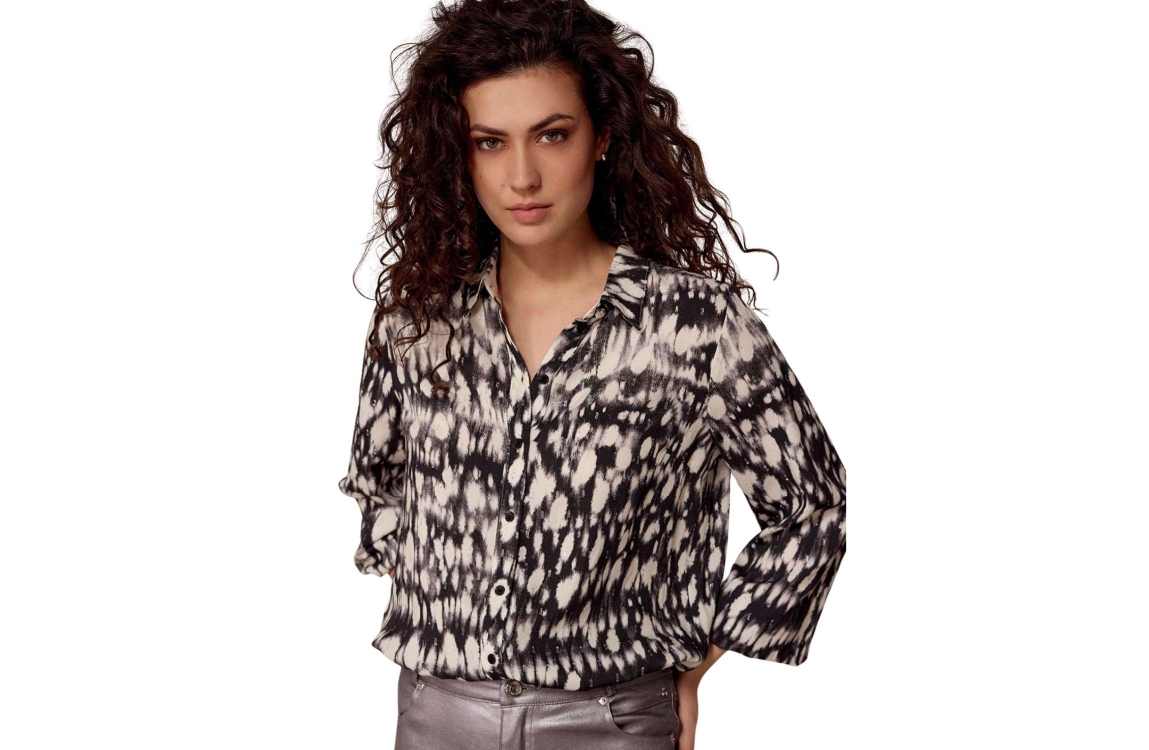 Tramontana blouse C39-18-301. Dit rechtvallende model heeft een kraag en lange mouwen. Deze zwarte blouse van Tramontana is all-over bewerkt met een grafische print en sluit aan de voorzijde door middel van knopen. Het model is all-over bewerkt met zilverkleurige glitterdraden.