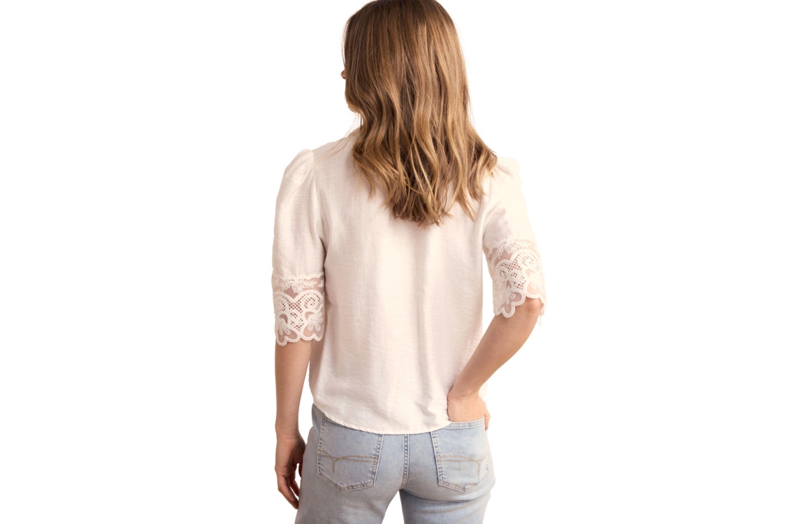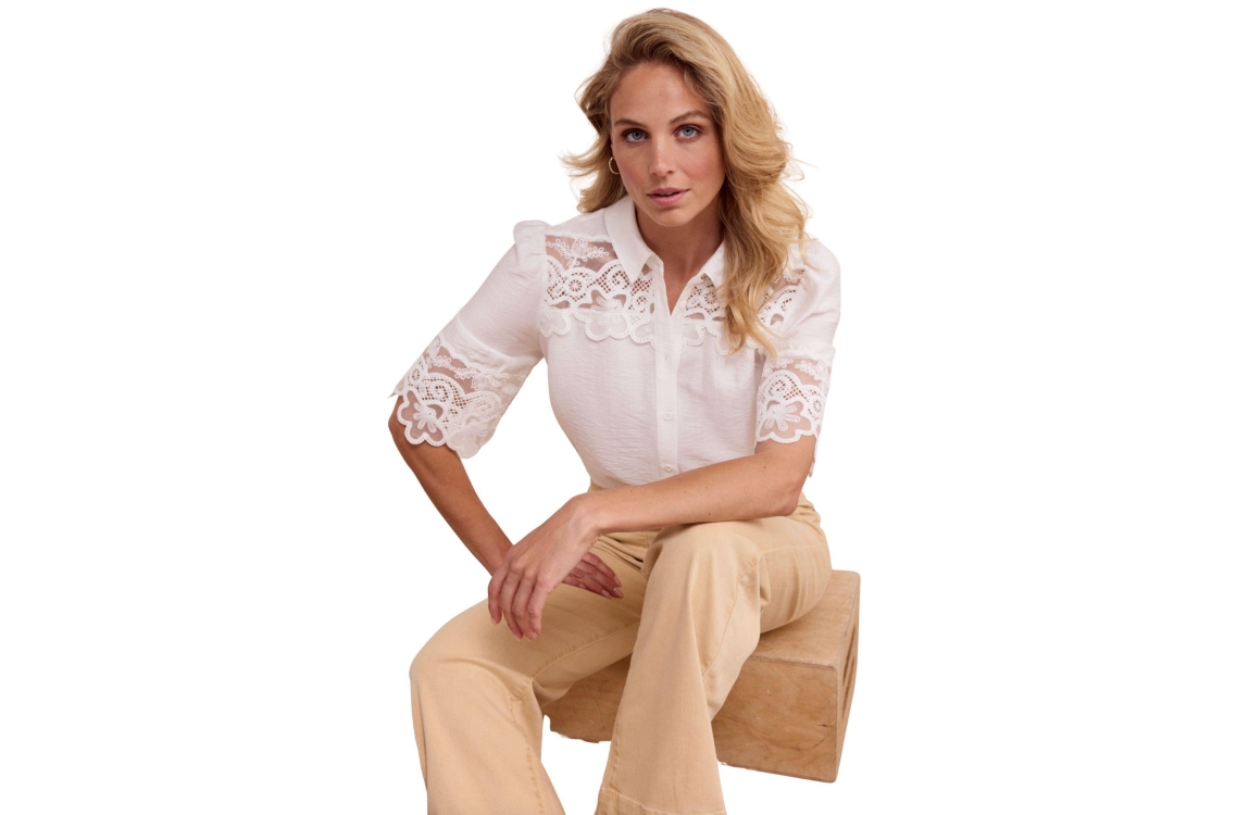 Tramontana blouse. O06-19-301. Dit rechtvallend model is voorzien van een kraag en heeft korte mouwen. Deze witte blouse van Tramontana sluit door middel van knopen en is bewerkt met kanten details.