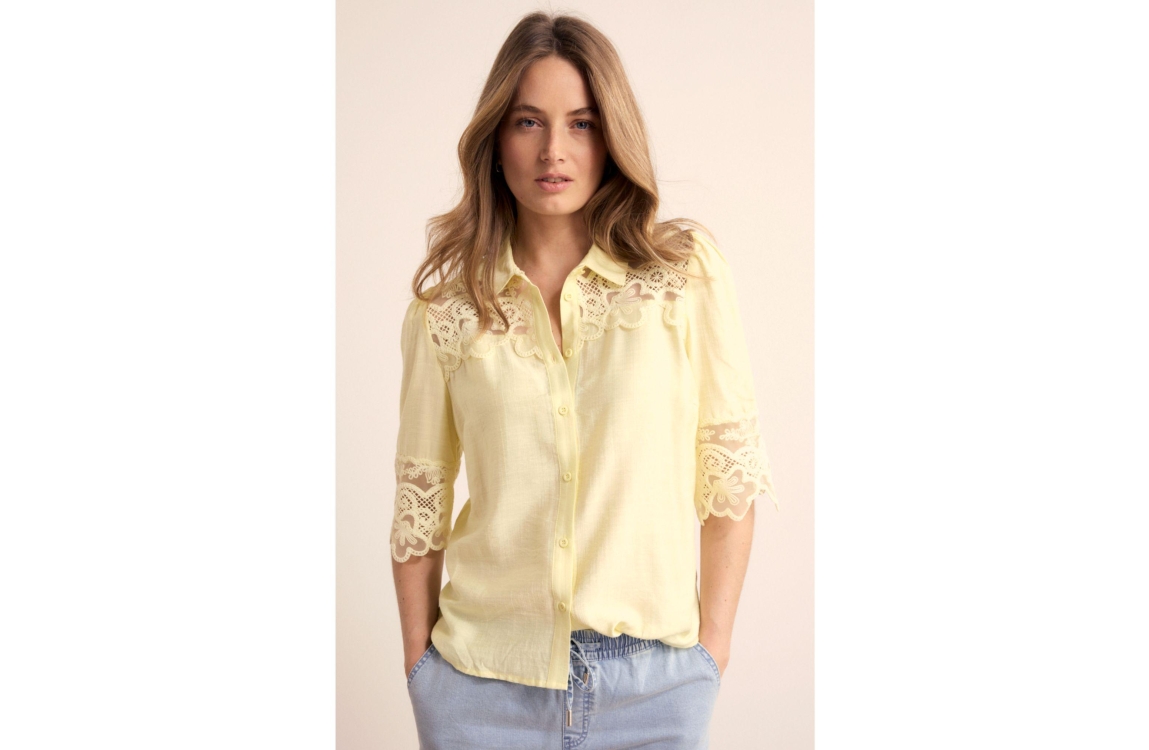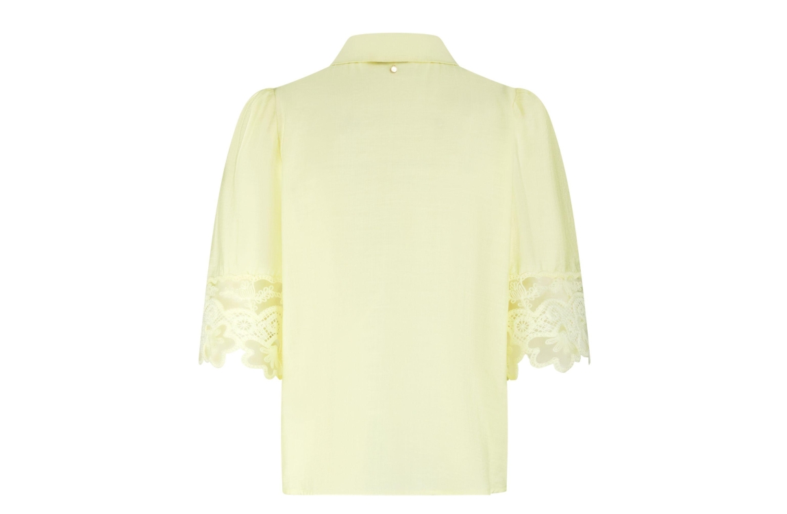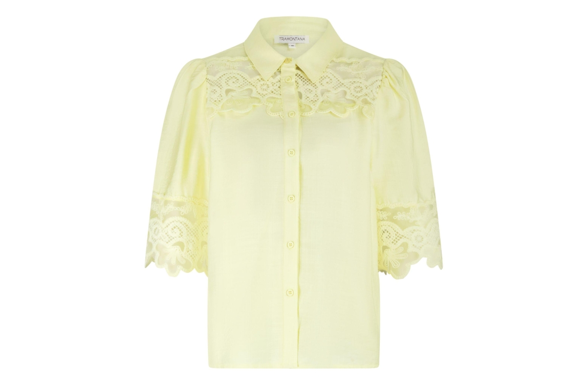 Tramontana blouse. O06-19-301. Dit rechtvallend model is voorzien van een kraag en heeft korte mouwen. Deze gele blouse van Tramontana sluit door middel van knopen en is bewerkt met kanten details.