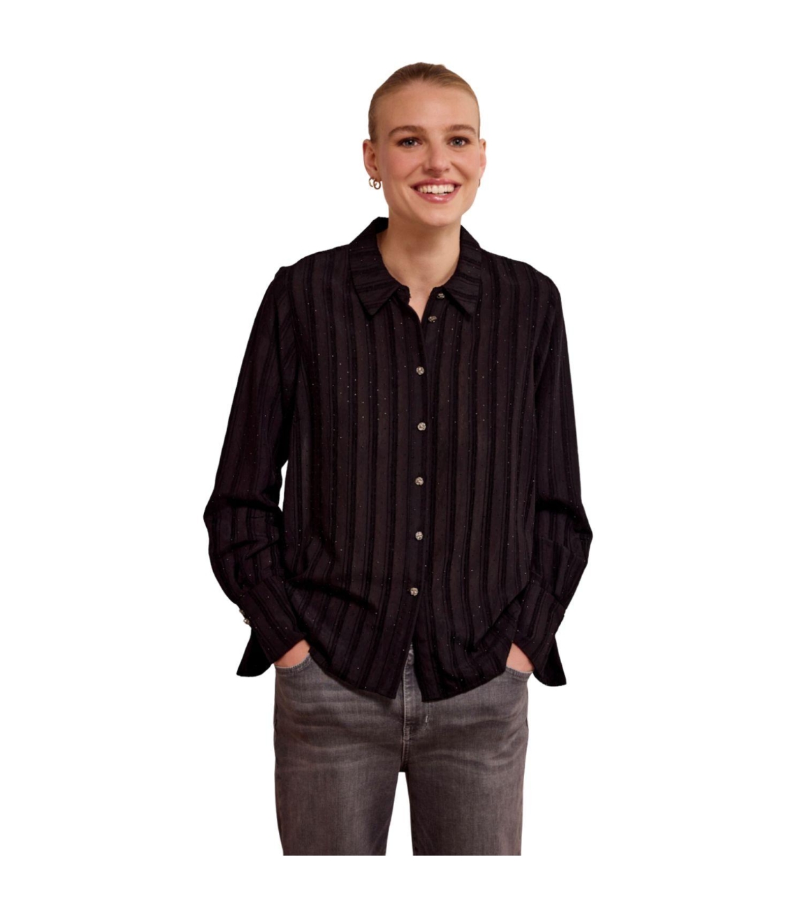 Tramontana blouse O04-18-301 9000. Dit rechtvallende model heeft een kraag en lange mouwen. Deze zwarte semi-transparante Tramontana blouse sluit aan de voorzijde door middel van bloemknopen en is all-over bewerkt met strass-steentjes.