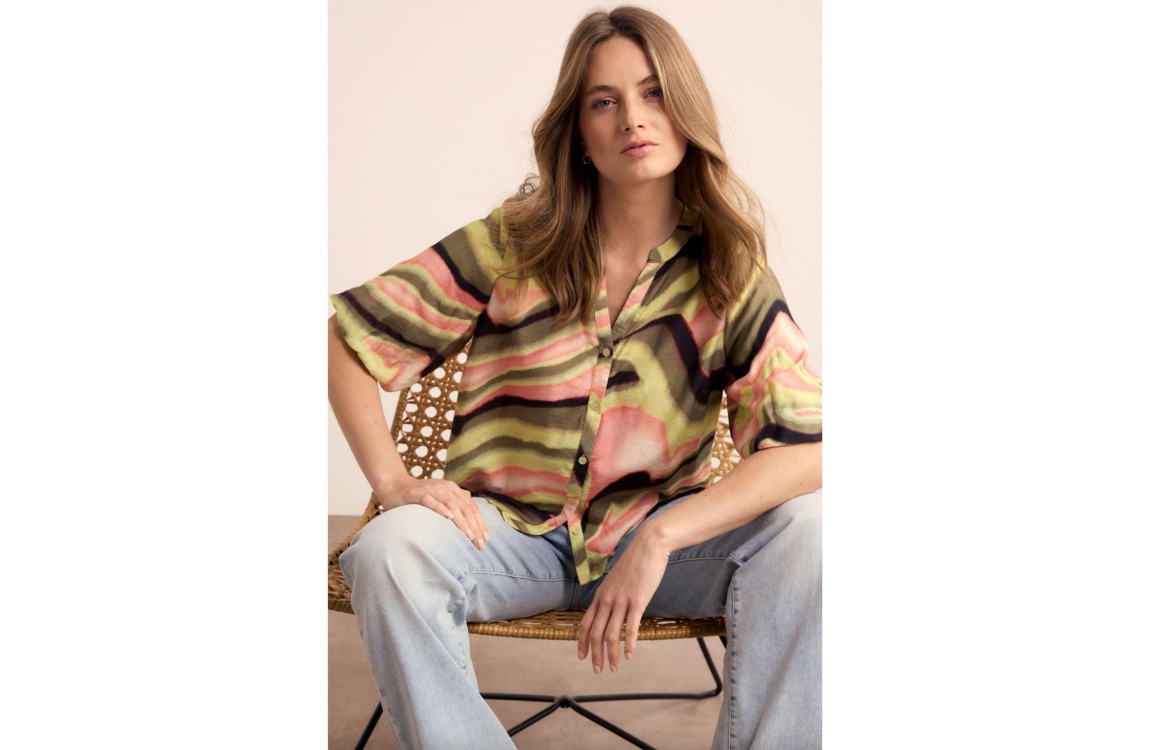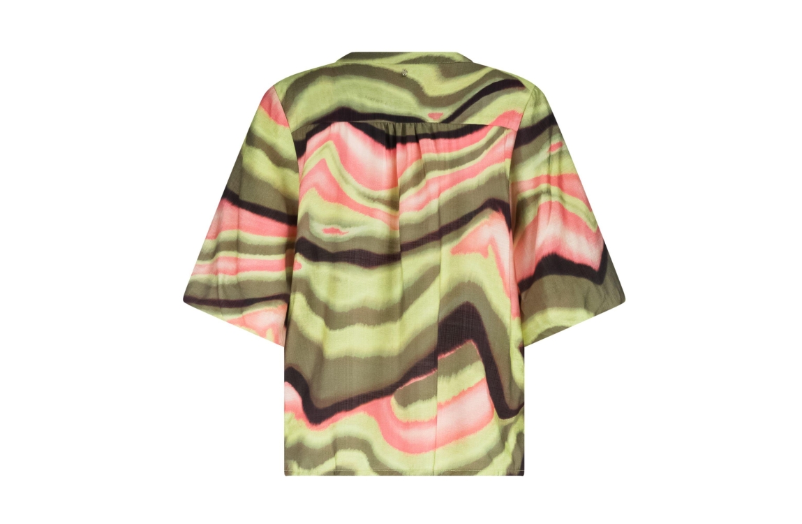Tramontana blouse sunset desert C18-19-301. Dit rechtvallend model is voorzien van een ronde hals met v-inkeping en heeft korte pofmouwen. Deze groene/roze blouse van Tramontana sluit door middel van knopen.