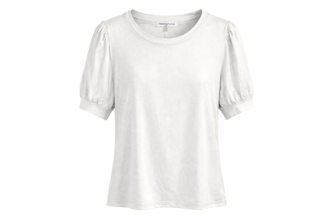 Tramontana coated puff-sleeve T-shirt D02-19-402. Dit rechtvallend model is voorzien van een ronde hals en heeft korte pofmouwen. Deze witte T-shirt van Tramontana is all-over bewerkt met een glitter coating.