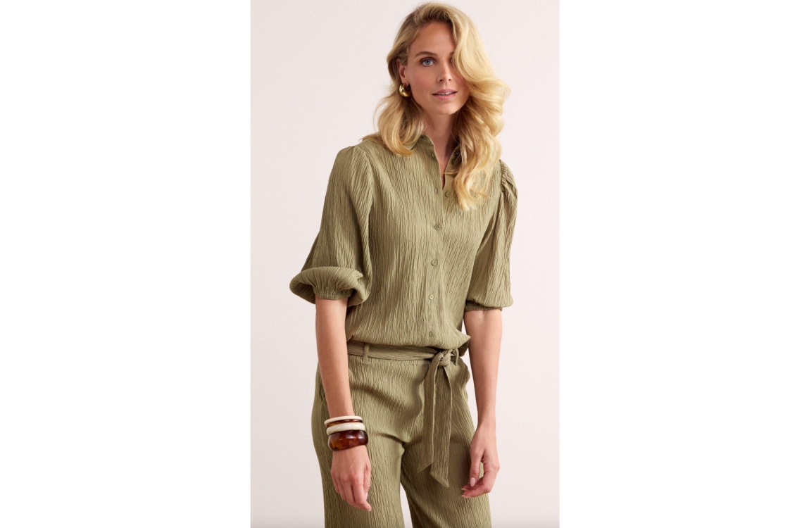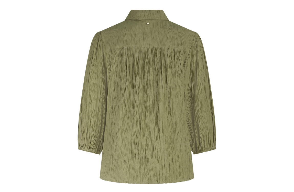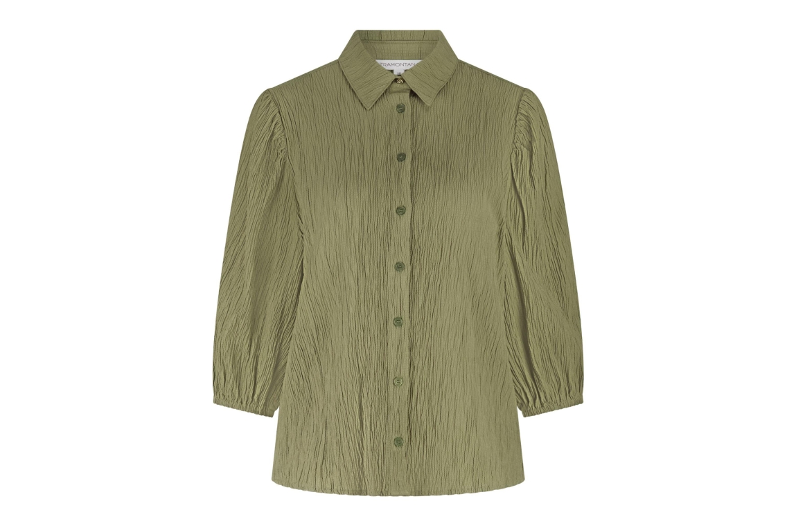 Tramontana creased puff-sleeve blouse C30-19-301. Dit rechtvallend model is voorzien van een kraag en heeft driekwart mouwen. Deze donkergroene blouse van Tramontana sluit door middel van knopen en is uitgevoerd in een gekreukte look.