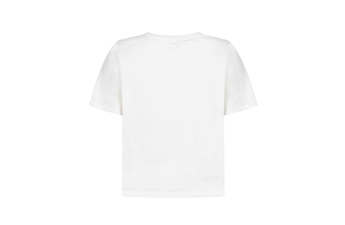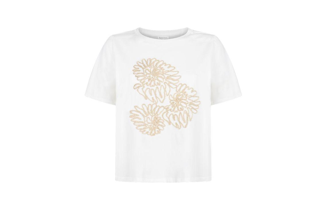 Tramontana T-shirt C44-20-401 1100. Het rechtvallende model heeft een ronde halslijn en korte mouwen. Dit off-white T-shirt van Tramontana is op het voorpand gedetailleerd met een geborduurd bloemmotief en uitgevoerd in stretchkwaliteit.