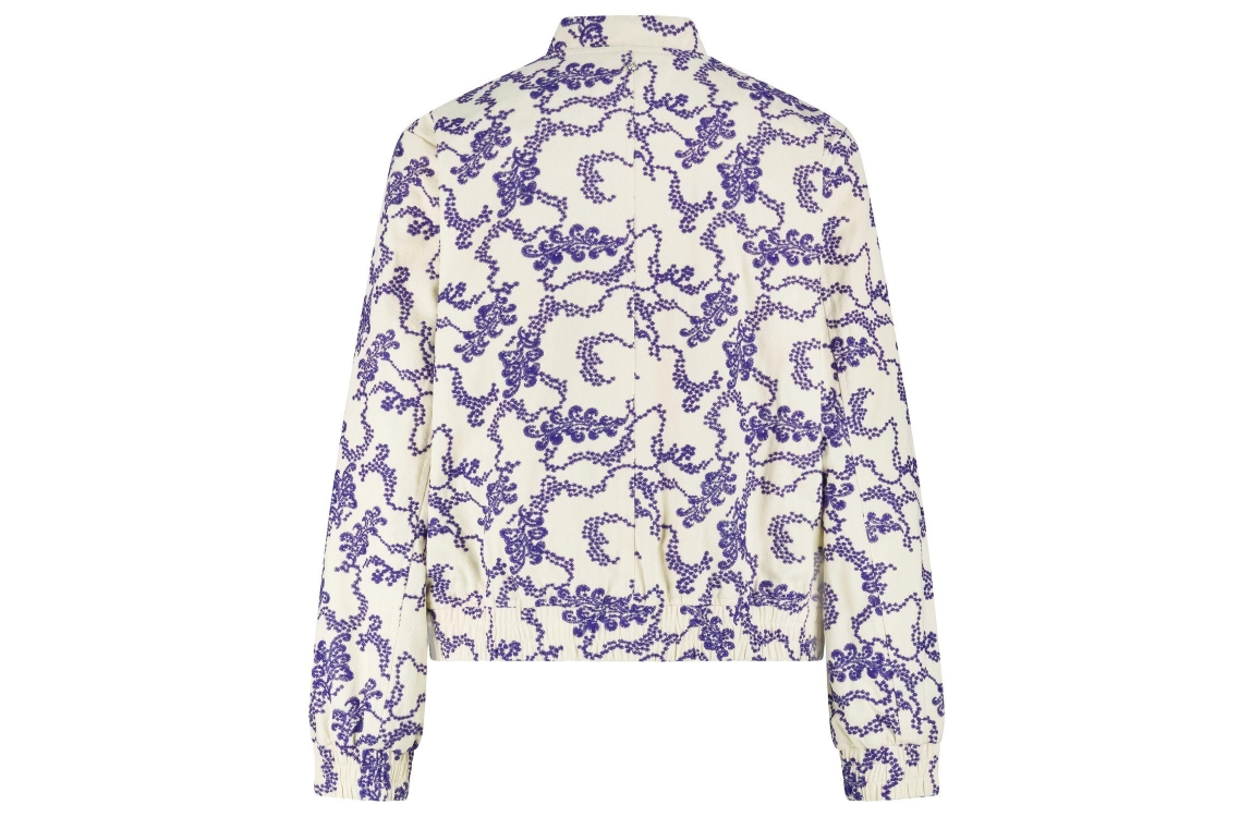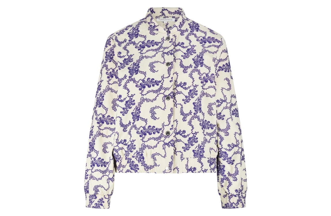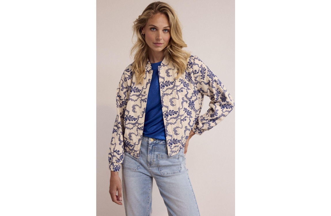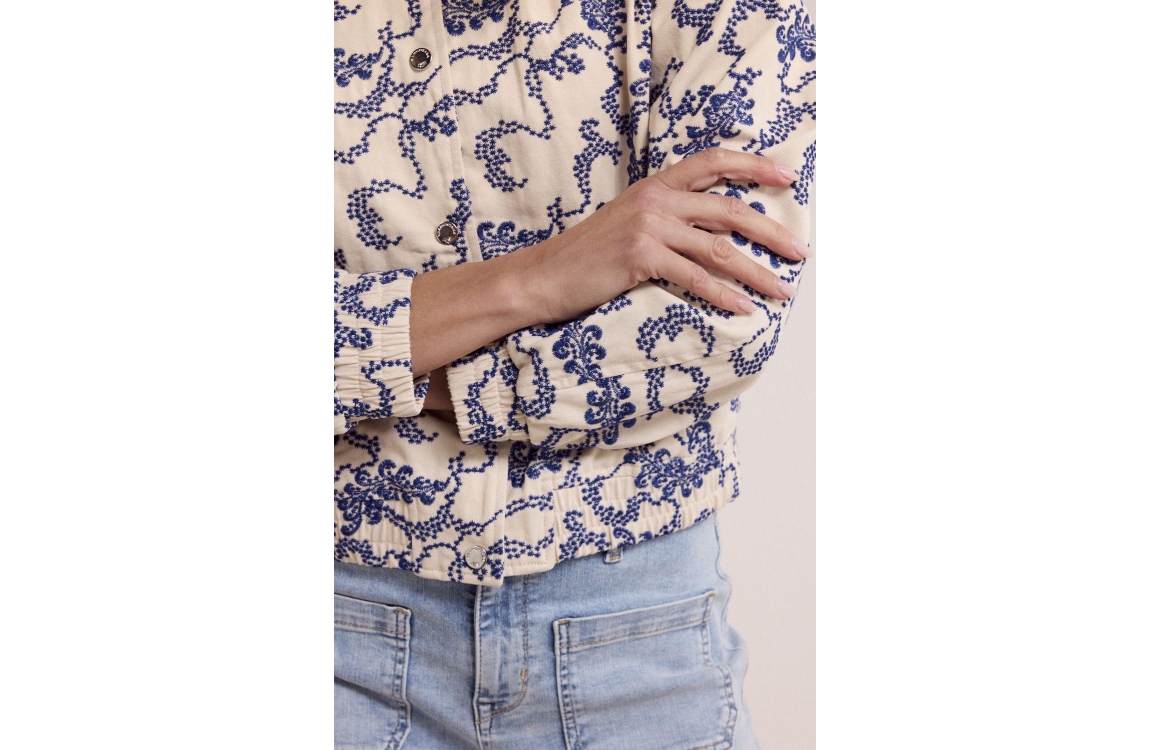 Tramontana Embroidered Bomber Jacket 006800 Stone. Dit bomber model is voorzien van een ronde opstaande hals en heeft lange mouwen. Deze beige bomber van Nukus sluit door middel van een knoopsluiting en is all-over bewerkt met een blauw borduurwerk. Dit model is voorzien van twee steekzakken aan de voorzijde en is afgewerkt met boorden.