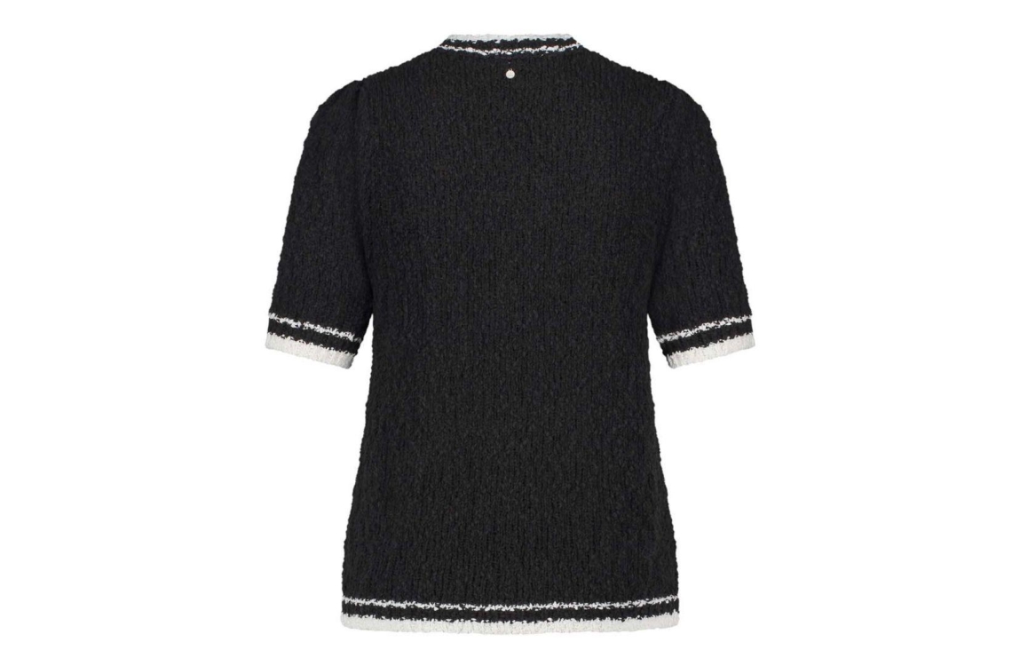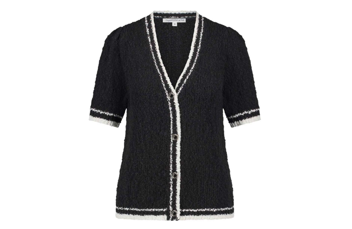 Tramontana vest Y04-16-702. Dit rechtvallend model is voorzien van een v-hals en heeft korte mouwen. Dit zwarte vest van tramontana is bewerkt met witte boorden en is gehaakt uitgevoerd. Dit model sluit door middel van knopen.