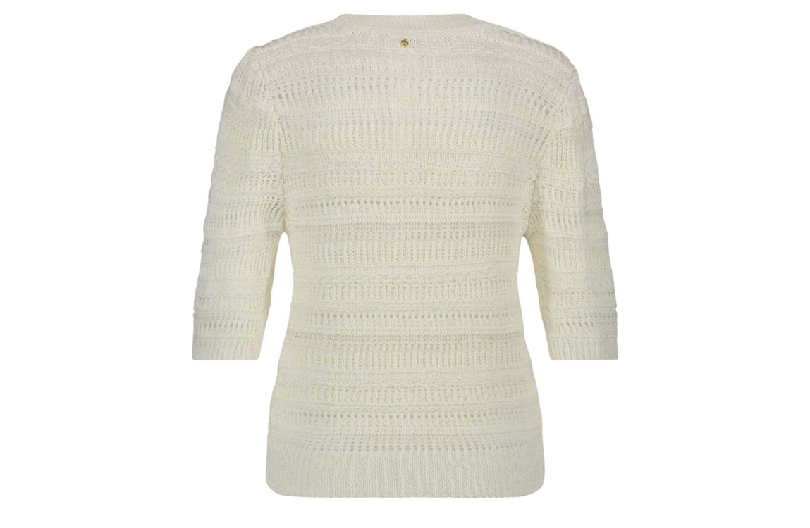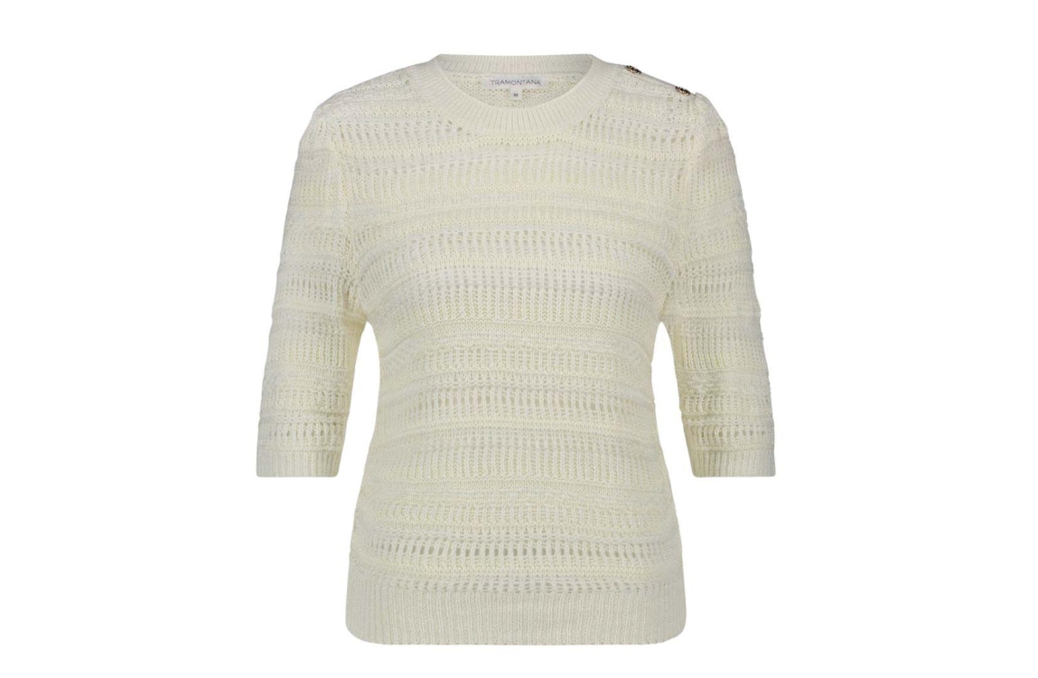 Tramontana jumper y02-16-601. Dit rechtvallend model is voorzien van een ronde hals en heeft halflange mouwen afgewerkt met goudkleurige knopen op linkerschouder. Deze witte jumper van Tramontana is gehaakt uitgevoerd.