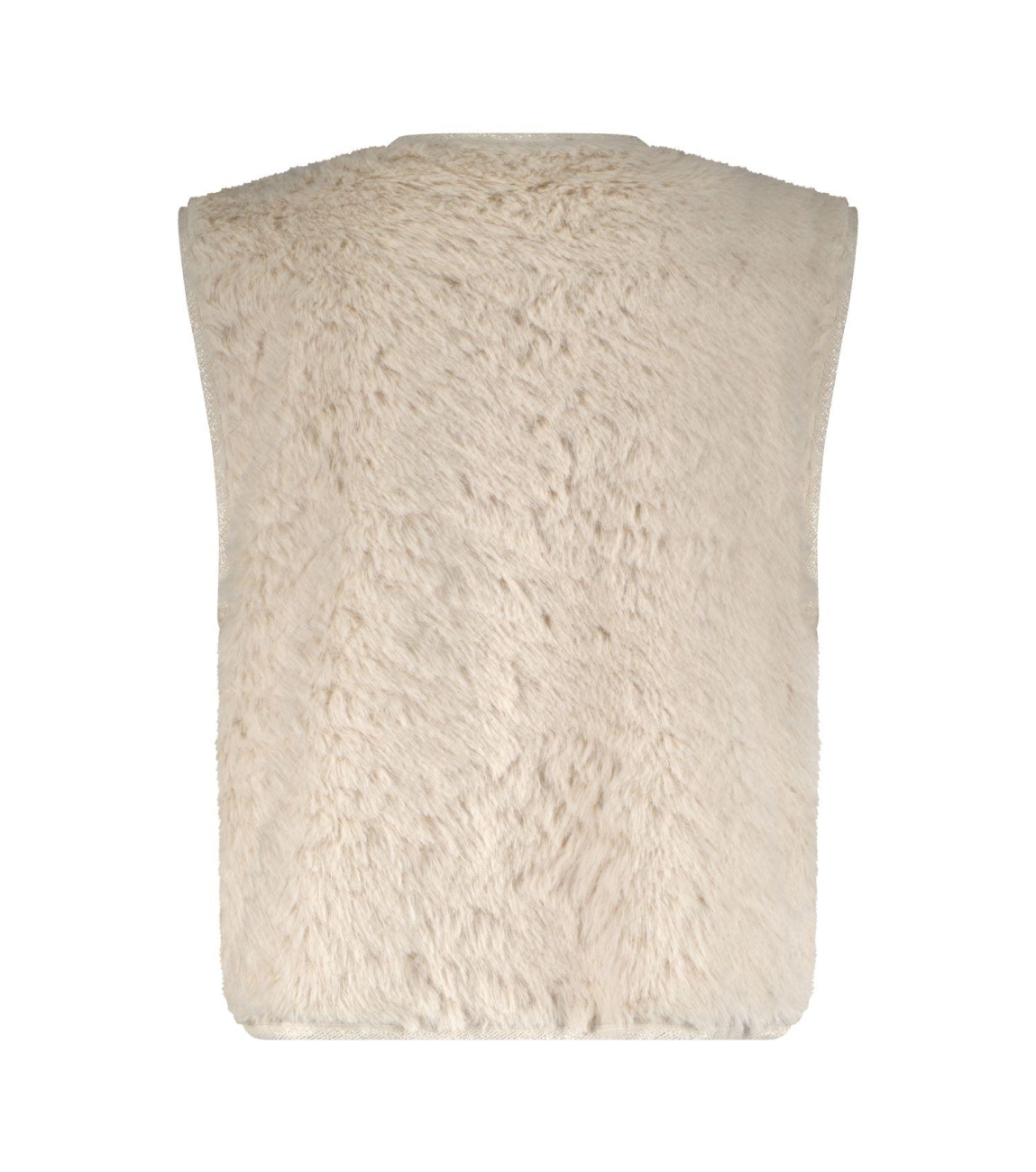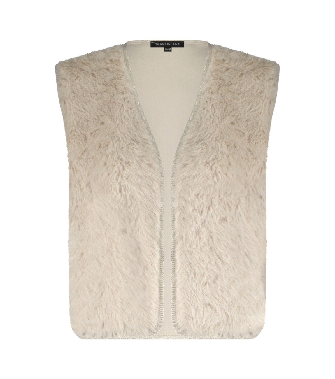 Tramontana Faux Fur Vest 6800 Stone. Dit rechtvallende model heeft een ronde hals en is mouwloos. Dit beige gilet van Tramontana heeft een open pasvorm en is rondom afgewerkt met een lurex.