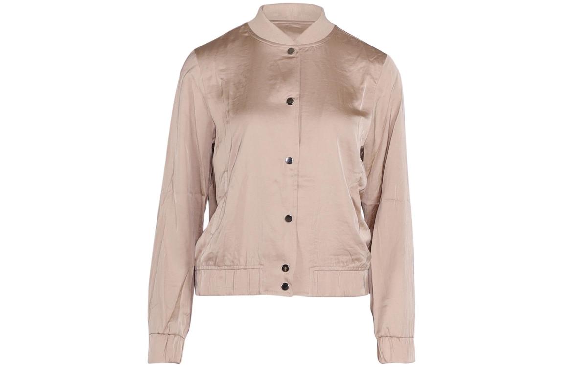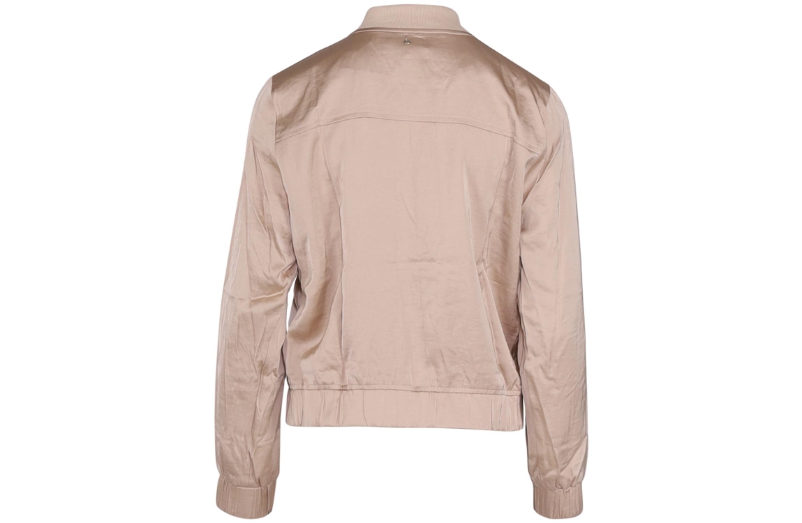 Tramontana bomberjasje C45-15-801. Dit bomber model is voorzien van een ronde hals en heeft lange mouwen. Deze zandkleurige satijnen bomber sluit door middel van drukknopen en heeft steekzakken.