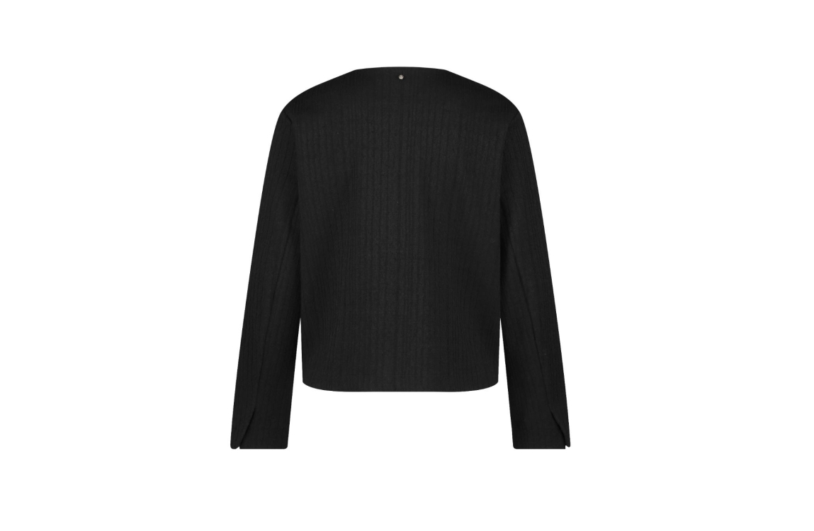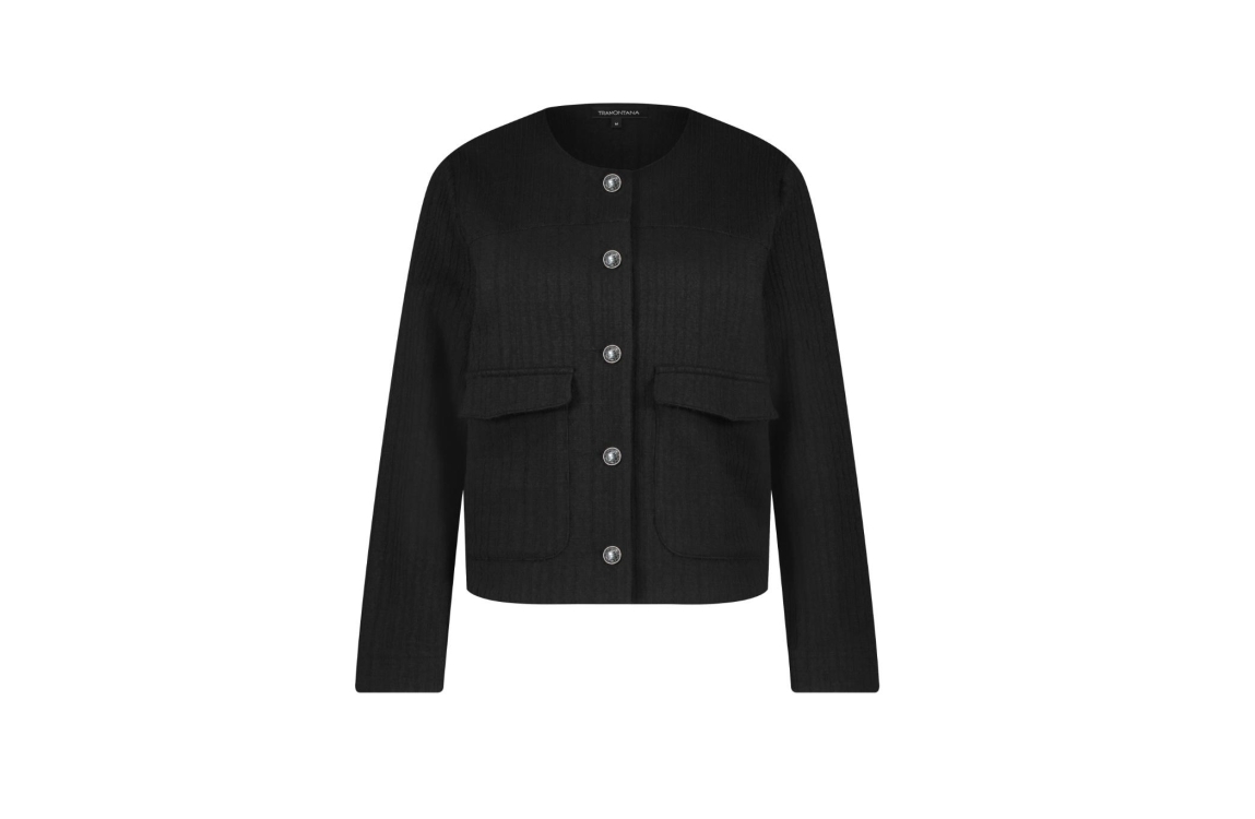 Tramontana jasje C26-13-801. Dit rechtvallend model heeft een ronde hals en lange mouwen. Deze zwarte jas van Tramontana sluit aan de voorzijde door middel van decoratieve knopen en beschikt over twee klepzakken.