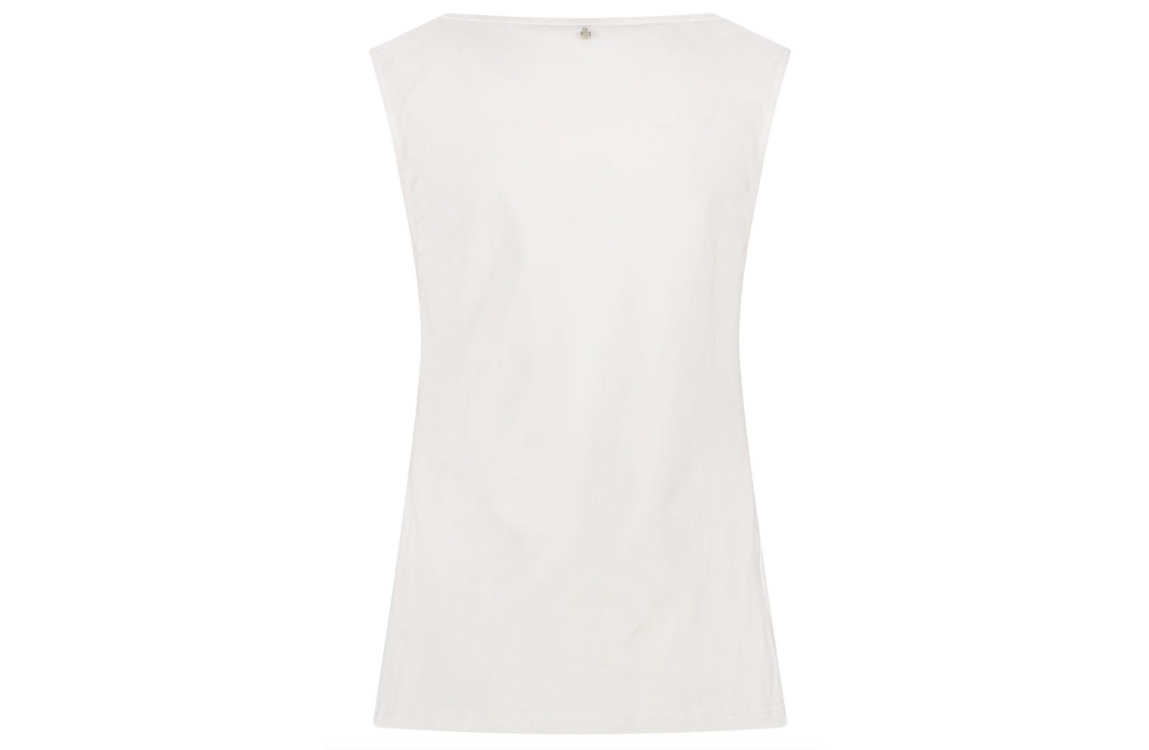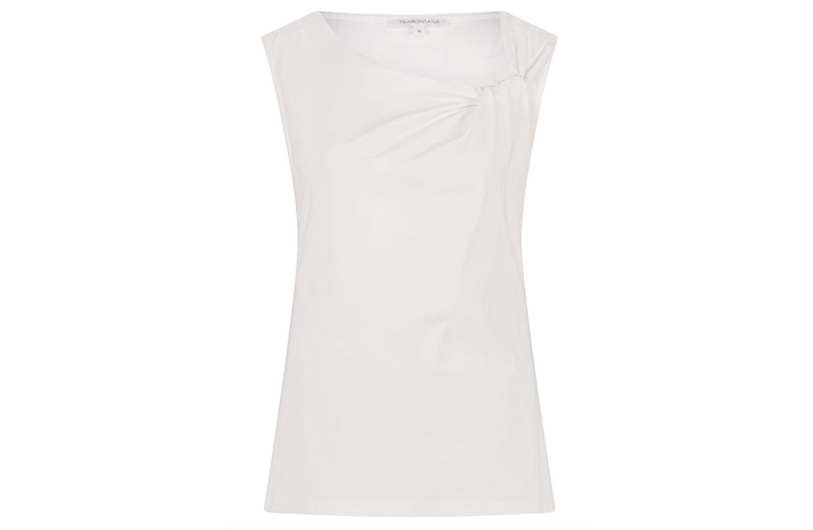 Tramontana singlet Q14-16-403. Dit witte rechtvallend model is voorzien van een ronde hals bewerkt met een knoopdetail en is mouwloos.