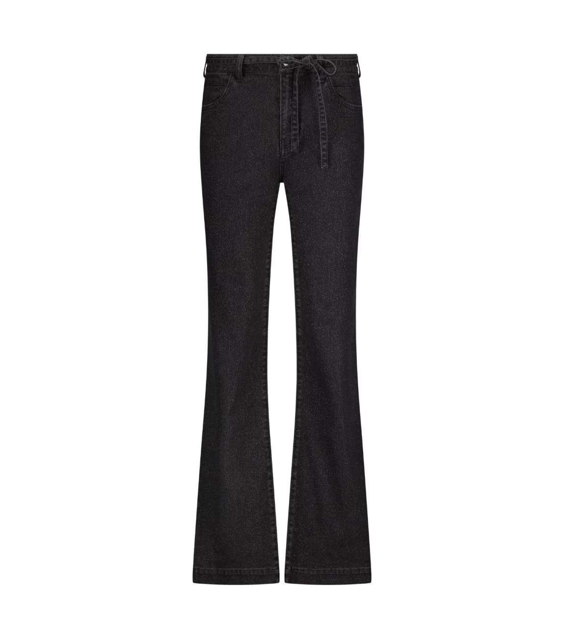Tramontana Lurex Wide-Leg Denim Trousers 9003 Black denim. Dit wide leg model sluit door middel van een knoop en rits afgewerkt met ceintuurlussen. Deze zwarte jeans is voorzien van zakken aan de voor- en achterzijde. Dit model heeft een afneembaar strikdetail en is all-over bewerkt met glitters.