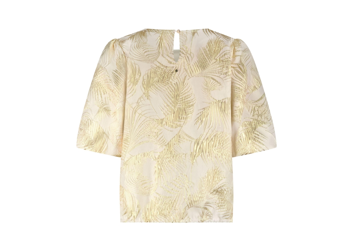 Tramontana palm jaquard top C39-19-401. Dit rechtvallend model is voorzien van een ronde hals en heeft korte pofmouwen. Deze goudkleurige top van Tramontana is bewerkt met een palmprint en sluit aan de achterzijde door middel van een knoopje.