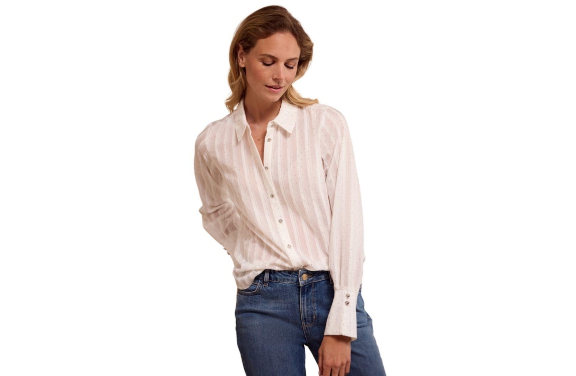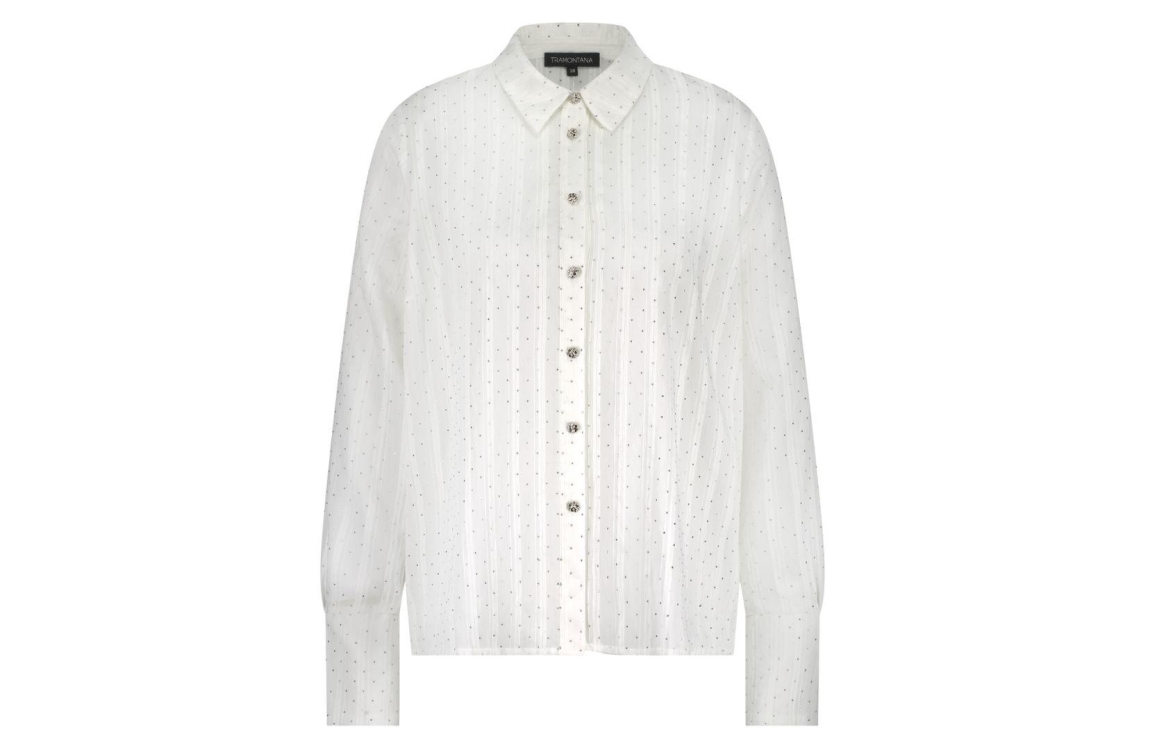 Tramontana blouse O04-17-301. Dit rechtvallende model heeft een kraag en lange mouwen. Deze off white blouse van Tramontana sluit door middel van gedetailleerde knopen en is semi-transparant uitgevoerd. Het model is all-over bewerkt met strass-steentjes en is afgewerkt met manchetten.