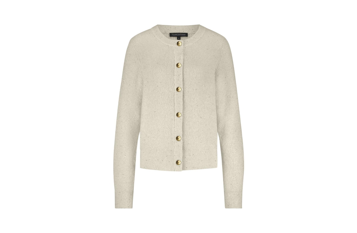 Tramontana Sequin Cardigan 006801 Stone melange. Dit rechtvallende model is voorzien van een ronde hals en lange mouwen. Dit beige kleurige vest sluit door middel van knopen en is all-over bewerkt met fijne pailletten.